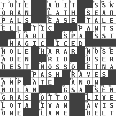 ACROSS 1. Haul 5. "This won't hurt ____!" 9. Compass dir. 12. Northwest Algerian city 13. Thin strip of wood or metal 14. Scorch 15. Friends 16. Comfort 17. Falsehood 18. Pipe bend 19. Nervous spasm 21. Leg coverings 22. Small pie 24. Health resort 26. Fast jet (abbr.) 27. Mysterious quality of enchantment 28. On the rocks 29. Undercover agent 30. Ethiopian city, capital of Harari 32. Olfactory organ 36. An important port of Yemen 37. To free from 38. One who uses or employs something 39. State of inaction 40. With motion or animation 42. Inactive volcano in Sicily 43. Romantic infatuation 44. All-night dance parties 46. Electrical Unit 49. Had dinner 50. Soon (poet.) 51. Pitcher Ryan 53. Girls' org. (abbr.) 54. Elected rep. 57. Pate de foie ____ 58. "Beetle Bailey" pooch 61. Not recorded 62. Globular water bottle used in Asia 63. "Terrible" tsar 64. Advice 65. Single 66. Unable to walk 67. Waist strap DOWN 1. Drink excessively 2. Relating to the mouth 3. Baron Munchausen's specialties 4. Followers of ems 5. Actor Baldwin 6. Sound made by sheep 7. It is 8. Definite Article 9. Actors Connery and Penn 10. Table seasonings 11. Obtain by seizing forcibly or violently 14. R.R. building 19. Three (prefix) 20. Hankering 21. Writing tablet 23. Representative 24. Large numbers or amounts 25. For each 27. Method 28. From or relating to Ireland 29. Impair 31. Came up 32. New (sp.) 33. Clearly or manifestly demonstrative 34. Elected reps. 35. Epoch 40. Floor covering 41. Mouths or openings 43. Baking dish 45. Santa ___, CA 46. White American of non-Hispanic descent 47. Person of subnormal intelligence 48. Food holder 52. White ___ sheet 53. Went 55. Morally bad or wrong 56. A home for chicks 58. Petroleum 59. Federal power corp. 60. Scottish cap 61. Experiment locale