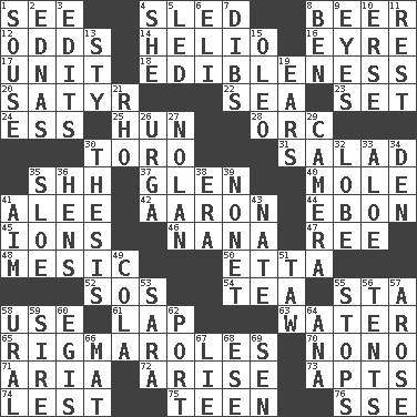 ACROSS 1. Observe 4. Downhill vehicle 8. Fermented drink made from hops 12. Likelihood 14. Sun: prefix 16. Jane of fiction 17. A single undivided whole 18. The property of being fit to eat 20. Letch 22. Ocean 23. Put into a specified state 24. Curvy letter 25. Attila the _ 28. The grampus (Milton) 30. "Corrida" creature 31. Vegetable dish 35. Quiet! 37. Small, secluded valley 40. Undercover agent 41. Toward shelter 42. Composer Copland 44. Inky black, to poets 45. Charged atoms 46. Grandmother 47. To sift 48. Of or pertaining to a meson 50. Singer James 52. Mayday 54. Afternoon social gathering 55. R.R. building 58. Purpose 61. Pet locale 63. Wetness 65. Frustrating wastes of time 70. Words to Nanette 71. Roberta Peters solo 72. Originate 73. Tenement units (abbr.) 74. For fear that 75. Adolescent 76. Compass dir. DOWN 1. Boozer 2. Ferber et al. 3. Prepares for publication 4. A female animal or person 5. Directed 6. Connecticut Ivy Leaguer 7. Rights 8. Benjamin's nick name 9. Snake ____ (dice throw) 10. Celtic language 11. Repose 13. Filthy place 15. Margarine 19. Hearing organs 21. 17th letter of the Greek alphabet 26. Capital and largest city of Mongolia 27. Pitcher Ryan 29. Device for capturing images 30. College paper 32. Ear part 33. _ vera 34. Lair 35. _ gin 36. Coop moms 38. Period 39. Music written for nine 41. Direct toward a target or goal 43. Nathan's nickname 49. Root beer relative 51. The 23rd letter of the Hebrew alphabet 53. "Two Mules for Sister ____" 55. Obstructs or blocks passage 56. Portable shelters 57. Came up 58. Mountain range 59. The founder of a family 60. Armor plate that protects the chest 62. Sweet dark-red dessert wine 64. Santa ___, CA 66. Floor protector 67. Untruth 68. Compass dir. 69. Elected rep.