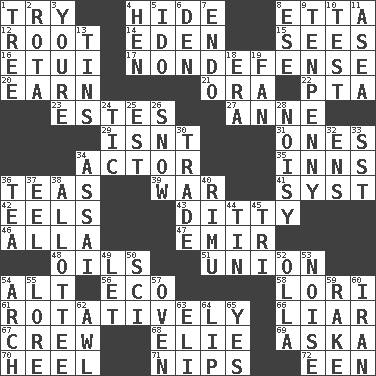 ACROSS 1. Attempt to accomplish something 4. Flintstone garb 8. Singer James 12. Carrot, for example 14. Locale of original sin 15. Perceives with the eye 16. Needle holder 17. Unrelated to defense, as in spending 20. Merit 21. Mouth or opening 22. Parent Teacher Assoc. 23. _____ Park, CO 27. Singer Murray 29. Is not 31. Washington bills 34. Thespian 35. Taverns 36. Afternoon social gatherings 39. Armed conflict 41. System (abbr.) 42. Snakelike fish 43. Simple song 46. Silent film actress Nazimova 47. Arab leader 48. Petroleums 51. The state of being joined or united 54. Keyboard modifier key 56. Environmental prefix 58. Australian parrot (variant) 61. Producing rotation 66. One who doesn't tell the truth 67. Group working together 68. Writer Wiesel 69. "____ silly question..." 70. Person who is morally reprehensible 71. Cuts off 72. Car or cant ending DOWN 1. Woody plant 2. Roll call or roster of names 3. You are 4. Layer 5. Wedding promise 6. Lair 7. Inside; within (prefix) 8. Compass dir. 9. 3-inch nail 10. Trial 11. At sea 13. Canisters 18. Period 19. Air blower 24. Nervous spasm 25. Eastern Standard Time (abbr.) 26. Frozen precipitation 28. Annoyingly loud 30. Swap 32. Followers of ems 33. Fast jet (abbr.) 34. Slender Brazilian palm 36. Afternoon social gathering 37. Snakelike fish 38. One to whom something is allotted 40. Tall New Zealand timber tree 44. Metal container 45. Three (prefix) 49. Allow 50. _-fi 52. Water jar 53. Annoying sound 54. Bowlike part 55. Old wives' tales, e.g. 57. Baking chamber 59. Immoral or dissolute person 60. SW Asia republic 62. Leather borer 63. Biblical high priest 64. Mouth edge 65. Affirmative reply