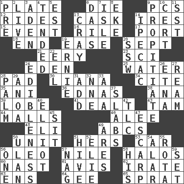 ACROSS 1. Food holder 6. Pass on 9. Personal Computers (abbr.) 12. Amusement-park features 13. Keg 14. Angers 15. Happening 16. Cause heat under the collar 17. Left side of a ship or aircraft 18. Conclude 19. Relaxation 20. Back-to-school mo. 21. Suggestive of the supernatural 23. _-fi 24. Genesis locale 25. Wetness 28. Groovy apt. 30. Climbing, woody, usually tropical vines 34. Quote 35. Black tropical American cuckoo 36. Ferber et al. 38. Santa ___, CA 39. Ear part 41. Started a card game 43. Scottish cap 44. Shopping centers 46. Toward shelter 48. Connecticut Ivy Leaguer 49. Lettered men learn these first 50. A single undivided whole 51. Possessive pronoun 53. Automobile 56. Butter sub 57. Mediterranean tributary 58. Saint headwear 60. Political cartoonist Thomas 61. Opinion 62. Feeling or showing extreme anger 63. Followers of ems 64. Turn to the right 65. Small fatty European fish DOWN 1. Before (prefix) 2. Not recorded 3. An important port of Yemen 4. Watched over 5. Eastern Standard Time (abbr.) 6. Raised platform 7. Capri or Wight 8. Make supply last 9. Appease 10. Foregone conclusion 11. Fast jet (abbr.) 13. Supercomputer manufacturer 14. Medicinal drug used to evoke vomiting 19. Bert's buddy 20. Compass dir. 22. Snakelike fish 24. The property of being fit to eat 26. Inactive volcano in Sicily 27. 480, 500 or 516 sheets of paper 28. Inside of hand 29. Small Philippine buffalo 31. Increase 32. Compass dir. 33. American Automobile Association (abbr.) 37. Thick slices 40. American author Paul (1891-1958) 42. Affectionate concern, for short 45. Be seated 47. Fortification 49. Ancient Greek god of war 50. ____ Bator, Mongolia 51. Hub of activity 52. Writer Wiesel 54. Having or resembling wings 55. Roll call or roster of names 56. Single 57. Tired old horse 58. Part of HMS, perhaps 59. Put into a specified state