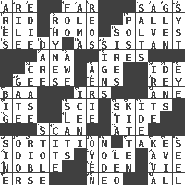 ACROSS 1. "We ___ not amused" (Victoria) 4. Distant 7. Settles 11. To free from 12. Hero or heavy, e.g. 13. Friendly 14. Biblical high priest 15. Like (prefix) 16. Finds the solution 17. Full of seeds 19. Aide 21. Wet nurse (var.) 23. Angers 24. Group working together 25. Grow older 26. Binary compound 29. Honkers 30. Followers of ems 31. Marina Del _, California 32. Sound made by sheep 33. Big collection agency 34. A saturated hydrocarbon 35. ___ a Wonderful Life 36. _-fi 37. Burlesque acts 40. Unit of force equal to gravity 41. Area sheltered from the wind 42. Periodic rise and fall of the sea level 43. Examine hastily 45. Had dinner 46. Determination 51. Receives possession of 55. Foolish or stupid persons 56. Grand slam 58. "___ Maria" 59. Impressive in appearance 60. Locale of original sin 61. Compete 62. Celtic language 63. Modern: prefix 64. Everything DOWN 1. Ancient Greek god of war 2. Cause heat under the collar 3. Singer Brickell 4. Egg _ yung 5. _ mater 6. Vintage cars 7. Table seasonings 8. Inventor's middle name 9. Small, secluded valley 10. System (abbr.) 12. Poems 13. Airs 16. Founders of families 18. Have the gumption 20. Attaches a signature 22. Deep reverence 24. Desist 25. Nest on high 26. Feeling or showing extreme anger 27. Habitations of wild animals 28. Sight organ 29. Yard entry 32. Large 33. Ancient Celtic tribe of eastern Britain 36. Narrow boards 37. R.R. building 38. Baby cat 39. The main thing one is thinking about 43. Fur scarf 44. Quote 46. Trig term 47. Aroma 48. Teases 49. Baking chamber 50. Connecting point 52. Polynesian shrub of the pepper family 53. Tending to cause great harm 54. Stitch closed the eyes of (a falcon) 57. Lion