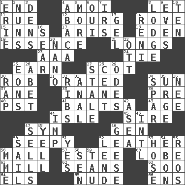 ACROSS 1. Conclusion 4. Mine, in Marseilles 8. Allow 11. Sorrow 12. French market town 14. Be footloose 15. Restaurants 17. Get up 18. Paradise 19. Gist 21. Yearns 23. American Automobile Association (abbr.) 24. Standoff 25. Merit 27. Native of Scotland 30. Director Reiner 31. Spoke pompously 34. Player for Phoenix 37. A saturated hydrocarbon 38. Silly 39. Before (prefix) 40. Pacific Standard Time (abbr.) 41. Greek mezzo-soprano Agnes 43. Grow older 44. Capri or Wight 45. Male parent of an animal 47. Symbol (abbr.) 49. Commissioned mil. rank 50. Oozy 52. Cordwainer's material 56. Promenade 57. First name in cosmetics 60. Ear part 61. Place where flour is made 62. Seines 63. "Barney Miller" actor Jack 64. Raised railways 65. Unadorned 66. Followers of ems DOWN 1. One of the Great Lakes 2. Religious women 3. Lairs 4. Phillipine bananalike plant 5. Greater amount 6. Fr. "Yes" 7. Big collection agency 8. Inn 9. Nights before holidays 10. Nine, plus one 13. Set 14. Painter Guido (1575-1642) 16. Dry up 20. Billionth: prefix 22. Baseball player Mel 25. Immeasurably long periods of time 26. Collude with 27. Lacking originality or spontaneity 28. Penny 29. Lyric poems 30. Hit sharply and swiftly 32. Chest bones 33. Of or related to the anus 34. Practice fight 35. Goad 36. Born 42. Toward the sea 44. Naughty child 46. International (abbr.) 47. Makes a sale 48. Shout 49. Honkers 50. Travel by water 51. Affirmative reply 52. Grant temporary use of 53. Flexible conduit 54. Inky black, to poets 55. Vintage cars 56. Madame (abbr.) 58. Elected rep. 59. The 19th letter of the Greek alphabet