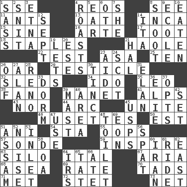 ACROSS 1. Compass dir. 4. Vintage cars 8. Perceive with the eye 11. Pismires 13. Pledge 14. South American Indian 15. Trig term 16. Johnson of "Laugh-In" 17. A blast of a horn 18. Paper fasteners 21. White Person, in Hawaii 22. Trial 23. White ___ sheet 25. "___ Little Indians" 26. Rowing implement 29. A testis 32. Bobsleighs 34. Wedding promise 35. Lion 38. Papal veil 39. French painter Edouard 41. High mountains 43. Not either 44. Curve 45. Join together 46. French bagpipes 50. Eastern Standard Time (abbr.) 51. Cuckoo 54. R.R. building 55. I made a mistake 57. Something which is sent 59. Stimulate to action 63. Grain storage tower 64. Slanted text style (abbr.) 67. Roberta Peters solo 68. Toward the sea 69. Pace 70. Bits 71. Was introduced to 72. Proofreading order 73. Remaining after all deductions DOWN 1. Backtalk 2. In a ____ (agitated or irritated) 3. Inactive volcano in Sicily 4. Cooks with dry heat, as in an oven 5. Hearing organ 6. Baseball player Mel 7. A female animal or person 8. Snout, nose 9. Learning spot: Fr. 10. Eroded 12. Back-to-school mo. 14. Call ___ day 19. Allows 20. Compass dir. 21. Actor Linden 23. Assistant 24. Native of Scotland 26. Order of Saint Francis (abbr.) 27. ____ Jay Lerner 28. Western Nevada city 30. Tinged 31. Enthusiasm 33. Dormintory (informal) 36. Writer Wiesel 37. Elects 39. Vertical spar for supporting sails 40. Type of rug 42. Arrange properly for use 45. United States Postal Service (abbr.) 47. Purpose 48. Bathroom plumbing fixture 49. Period of immesurable duration 51. Indian state 52. Annoying sound 53. An arm off of a larger body of water 56. Argument over a trivial matter 58. ___ good deed 60. SW Asia republic 61. Travel on or in a vehicle 62. Compass direction 64. Big collection agency 65. Make lace 66. Had dinner