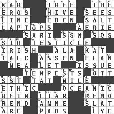 ACROSS 1. Armed conflict 4. Woody plant 8. Definite Article 11. Greek god of love 13. Hub of activity 14. Observes 15. Citrus frut 16. Paradise 17. Table seasoning 18. Portable computers 21. Nest on high 22. Indian skirt 23. Compass dir. 25. Distress signal 26. Title for a knight 29. One of the two male reproductive glands 32. From or relating to Ireland 34. In the manner of 35. Krazy ___ of comics 38. Baby powder 39. NE Netherlands city 41. Liveliness 43. Teachers' org. 44. Allow 45. Come out of 46. Storms 50. Baseball player Mel 51. Fast jet (abbr.) 54. Make lace 55. "Death on the ____" 57. Value system 59. Pertaining to the sea 63. It's straight from the horse's mouth 64. One who doesn't tell the truth 67. San ____ (Riviera town) 68. Tear apart 69. Queen of England 1702-14 70. Narrow board 71. "We ___ not amused" (Victoria) 72. Writing tablets 73. Potassium hydroxide DOWN 1. Water source 2. Operatic vocal solo 3. Play 4. College paper 5. To free from 6. Night before a holiday 7. Car or cant ending 8. Pulls into pieces 9. Sun: prefix 10. _____ Park, CO 12. Puts into a specified state 14. Compass dir. 19. Pledge 20. Before (prefix) 21. Leather borer 23. Filth; sediment 24. Examine minutely or intensely 26. Be seated 27. SW Asia republic 28. Cause heat under the collar 30. Clothes sense 31. Makes supply last 33. Leave at once 36. In addition 37. Drawn tight 39. _ mater 40. Back-to-school mo. 42. Remaining after all deductions 45. Capri or Wight 47. And so on (abbr.) 48. Sounds asleep 49. Nervous spasm 51. Father Junipero _ 52. Bull 53. One or ones belonging to thee 56. Hearing organs 58. Working for oneself (abbr.) 60. 1994 drama film starring Jodie Foster 61. "If ____ say so..." 62. ____ d'Azur (French Riviera) 64. Infant locale 65. _ tizzy (2 wds.) 66. Also