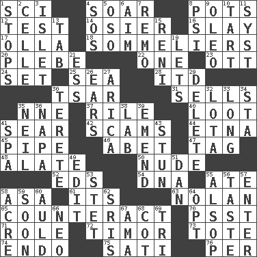 ACROSS 1. _-fi 4. Fly high 8. Cooking vessels 12. Trial 14. Flexible twig of a willow tree 16. Kill 17. Water jar 18. Wine waiters 20. Military trainee 22. Single 23. Baseball player Mel 24. Arrange properly for use 25. Ocean 28. It would 30. Russian ruler of old 31. Makes a sale 35. Compass dir. 37. Cause heat under the collar 40. Plunder 41. Shrivel 42. Fraudulent business schemes 44. Inactive volcano in Sicily 45. Corncob 46. Collude with 47. Label 48. Having winglike extensions 50. Naked 52. Begley and Asner 54. Heredity factor (abbr.) 55. Had dinner 58. White ___ sheet 61. ___ a Wonderful Life 63. Pitcher Ryan 65. Act in opposition 70. Inconspicuous attention getter 71. Hero or heavy, e.g. 72. Southeast Indonesia island 73. Lug 74. Inside; within (prefix) 75. Suttee (variant) 76. For each DOWN 1. Constricts 2. Cell (Danish) 3. Small island 4. Distress signal 5. Bear (Spanish) 6. Direct toward a target or goal 7. San ____ (Riviera town) 8. 23rd letter of the Greek alphabet 9. Margarine 10. Small pie 11. System (abbr.) 13. Keyboard key 15. Painter Guido (1575-1642) 19. Allows 21. Double-curved letter 26. Hearing organs 27. N. Chile seaport 29. Keyboard key 30. Cylindrical with tapered ends 32. Globular water bottle used in Asia 33. Having great length 34. R.R. building 35. Famous astronaut Armstrong 36. California wine valley 38. Experiment locale 39. Make improvements or corrections to 41. Health resort 43. Make senseless or dizzy 49. Prepare for publication 51. Daniel's nick name 53. Proofreading order 55. Columnist Joseph or Stewart 56. Clothes sense 57. Keyboard key 58. 43,560 square feet 59. Within a short period 60. Old (Scot.) 62. Indian titles of respect 64. Elect 66. Modern: prefix 67. Nanny (var.) 68. Small bed 69. Three (prefix)