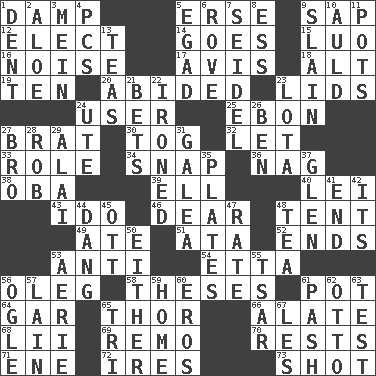 ACROSS 1. Moist 5. Celtic language 9. Plant excrement 12. Opt 14. Leaves 15. Nilotic language 16. Annoying sound 17. Opinion 18. The first octave above the treble staff 19. Nine, plus one 20. Stayed 23. Flaplike coverings 24. One who uses or employs something 25. Inky black, to poets 27. Naughty child 30. Coat; cloak 32. Allow 33. Hero or heavy, e.g. 34. Fastener 36. Tired old horse 38. Chief or king in Benin or Nigeria 39. Pipe bend 40. Flowery wreath 43. Wedding promise 46. Letter starter 48. Portable shelter 49. Had dinner 51. _ moment's notice (2 wds.) 52. Extremities 53. Against 54. Singer James 56. Cassini of fashion 58. College papers 61. Plant holder 64. Slender fish 65. Son of Odin 66. Having winglike extensions 68. Cards in a Roman deck? 69. San ____ (Riviera town) 70. Musical pauses 71. Compass dir. 72. Angers 73. Guess DOWN 1. Gouge 2. Medicinal plant 3. Chow _ 4. Personal Computers (abbr.) 5. Mild oath 6. Be footloose 7. A glass for beer 8. Double-curved letter 9. Killed 10. Old (Scot.) 11. Cooking vessels 13. Beverages made from leaves 21. Stakes 22. Pressed 23. Globular water bottle used in Asia 24. Shoshoni 26. Benjamin's nick name 27. Sis' sibling 28. Director Reiner 29. Mountain range southwest of Kyrgyzstan 31. An organ shaped like a helmet 35. Food holders 37. Small, secluded valley 41. Conclusion 42. It is 44. Mild oath, euphamism for damn 45. Baseball player Mel 47. Assign a rank or rating to 48. Beverage made from leaves 50. One or the other 53. Nest on high 55. Russian ruler of old 56. Stare at amorously 57. (Had) reclined 59. Dwelling 60. Greek god of love 61. Romantic infatuation 62. Von Bismarck 63. Trial 65. Three (prefix) 67. French article