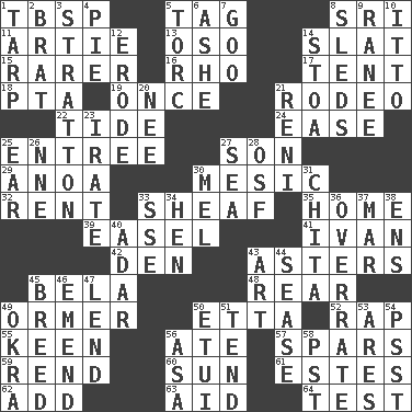 ACROSS 1. Cook's measure (abbr.) 5. Label 8. _ Lanka 11. Nick name for Arthur 13. Bear (Spanish) 14. Narrow board 15. Less widely known 16. 17th letter of the Greek alphabet 17. Portable shelter 18. Parent Teacher Assoc. 19. Single time 21. Cowboy competition 22. Event that recurs at intervals 24. Comfort 25. Main course 27. Male offspring 29. Small Philippine buffalo 30. Of or pertaining to a meson 32. Monthly bill 33. Archer's quiver 35. Residence 39. Artist's stand 41. "Terrible" tsar 42. Lair 43. Michaelmas daisies 45. Actor Lugosi 48. Stern 49. Channel Islands abalone 50. Singer James 52. Reproach for some lapse or misdeed 55. Peachy ____! 56. Had dinner 57. Practice fights 59. Tear apart 60. Player for Phoenix 61. _____ Park, CO 62. Say or write further 63. Assist 64. Trial DOWN 1. Canvas cover 2. Naughty child 3. Ski resort town in Vermont 4. Sliced dessert 5. Torque (variant) 6. American tennis player Robert 7. Thick or sticky substance 8. Bobsleighs 9. The wife of a rajah (variant) 10. "Tell ____ the Marines!" 12. Eat (away) 14. Portico 20. Born 21. Painter Guido (1575-1642) 23. Feeling or showing extreme anger 25. Ewer handle 26. Compass dir. 27. Ocean 28. Order of Saint Francis (abbr.) 30. Cartoonist voice _ Blanc 31. Riviera of "Kiss of the Spider Woman" 33. Compass dir. 34. Layer 36. Make much ado about nothing 37. Third mo. 38. Followers of ems 40. The sixth month of the Jewish calendar 43. Tate display 44. Gospel singer Marvin 45. A special lineage 46. Make improvements or corrections to 47. Grant temporary use of 49. Gumbo ingredient 50. Needle case 51. Look after 53. Ancient Greek god of war 54. Inconspicuous attention getter 56. White ___ sheet 58. Pacific Standard Time (abbr.)