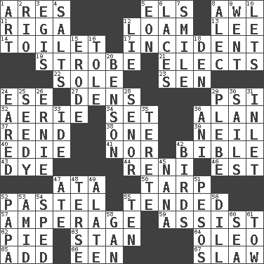 ACROSS 1. Ancient Greek god of war 5. Raised railways 8. Leather borer 11. Capital of Latvia 12. Rich soil 13. Area sheltered from the wind 14. Bathroom plumbing fixture 17. Event 19. Disco prop 21. Opts 22. Flatfish 23. Elected rep. 24. Compass dir. 27. Habitations of wild animals 29. Air pressure measure (abbr.) 32. Nest on high 34. Put into a specified state 36. ____ Jay Lerner 37. Tear apart 38. Single 39. Famous astronaut Armstrong 40. Singer Brickell 41. And not 42. God's Word 43. Color 44. Painter Guido (1575-1642) 46. Eastern Standard Time (abbr.) 47. "One Day ___ Time" 50. Canvas cover 52. Soft color 55. Watched over 57. Electrical Measurement 59. Help 62. Sliced dessert 63. Comedian Laurel of Laurel & Hardy 64. Margarine 65. Say or write further 66. Car or cant ending 67. Cole _ (cabbage dish) DOWN 1. Nonscientific branch of learning 2. _ de Janeiro 3. The front part of a cuirass 4. Table seasonings 5. A really long time 6. Shoestrings 7. Grin 8. Actor Baldwin 9. Left 10. Allows 12. Falsehood 15. Wear away 16. Lacquered or enameled metalware 18. Lair 20. Gillaume's butler role 24. Having ears or earlike features 25. Full of seeds 26. Bert's buddy 28. Sir (Sp.) 29. Cadet 30. Travels by water 31. An arm off of a larger body of water 33. Binary compound 35. Cigar-shaped 36. Black tropical American cuckoo 42. Avian creatures 45. Nanny 47. Had dinner 48. Laconic 49. Having winglike extensions 51. Mexican monetary units 52. Dad 53. Among 54. Hurried 55. "___ Little Indians" 56. Deli pickle 58. Separate the seeds from cotton 60. Ocean 61. Pull behind