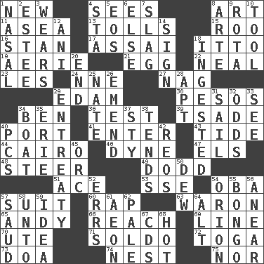 ACROSS 1. ___ Haven, CT 4. Perceives with the eye 8. Nonscientific branch of learning 11. Toward the sea 13. For Whom the Bell _____ 15. Friend of Pooh 16. Comedian Laurel of Laurel & Hardy 17. Slender Brazilian palm 18. "Tell ____ the Marines!" 19. Nest on high 21. Ovum 22. Actress Patricia 23. French article 24. Compass dir. 27. Tired old horse 29. Dutch treat 30. Mexican monetary units 34. Benjamin's nick name 36. Trial 39. Sadhe (variant) 40. Left side of a ship or aircraft 41. Keyboard key 43. Periodic rise and fall of the sea level 44. Capital of Egypt 46. Centimeter-gram-second unit of force 47. Raised railways 48. Guide 49. Texas town _ City 51. Adept person 53. Compass dir. 54. Chief or king in Benin or Nigeria 57. Set of matching outer garments 60. Strike 63. Make _____ (do battle with) 65. Actor Griffith 66. Arrive at 69. Actor's bit 70. Shoshoni 71. Twentieth part of a lira 72. Ancient Roman robe 73. ___ good deed 74. Egg locale 75. And not DOWN 1. Rhinal 2. First name in cosmetics 3. Erodes 4. R.R. building 5. Greek goddess of the dawn 6. Otherwise 7. Volcanic refuse 8. Johnson of "Laugh-In" 9. Roll call or roster of names 10. Instrument 12. Cuckoo 14. Attach a signature 18. Consumed 20. Conclusion 25. Nathan's nickname 26. Make improvements or corrections to 28. Fitting 29. Plea 31. Move on water 32. Probability 33. Perceive with the eye 34. Water vessel 35. One of the Great Lakes 37. Filthy place 38. Is inclined (to) 40. Personal Computers (abbr.) 42. Vintage cars 45. The grampus (Milton) 50. Morning condensation 52. Blunders 54. Constellation of myth 55. Beat drum 56. Approach 57. Saudi Arabian king (1953-1964) 58. To (old English) 59. The content of cognition 61. Period of immesurable duration 62. Light colored 64. The first octave above the treble staff 67. Music discs 68. Being at a high temperature