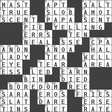 ACROSS 1. Vertical spar for supporting sails 5. Fitting 8. Table seasoning 12. Loyal 13. Messy guy 15. Mine, in Marseilles 16. Odor 18. Dad 19. Emitted 20. Sliced dessert 22. Crying or shouting loudly 24. Blunders 26. Nine, plus one 27. Anneal 28. Compass dir. 29. Accounting whiz (abbr.) 32. At once, immediately (arch.) 35. Small Philippine buffalo 37. Actor Linden 38. Kenny Rogers chart-topper in '80 39. Afternoon social gathering 40. Water source 41. Sight organ 42. Lacerate 43. Type of rug 44. Curvy letter 45. Directed 46. Merit 49. Storage container 50. Passed on 51. Mood resulting from idleness 55. To riddle 56. "Two Mules for Sister ____" 57. Greek god of love 59. Strips of potato fried in deep fat 63. Narrow board 64. Have the gumption 65. Celtic language 66. Airtight sealed metal containers 67. Allow 68. Assign a rank or rating to DOWN 1. Mountains (abbr.) 2. Curve 3. Institute legal proceedings 4. 3-inch nail 5. Cleo's killer 6. Frolic 7. Drink excessively 8. Indian antelope 9. So be it 10. Yearn 11. Teat (slang) 14. Greek mezzo-soprano Agnes 17. Hoop that covers a wheel 21. Period 23. Area sheltered from the wind 25. Scheduled 28. Flew 29. "Mermaids" star 30. Diluted with white 31. Silent film actress Nazimova 32. Toward shelter 33. Negative votes 34. Lyric poems 36. Teachers' org. 40. Nomad 42. Looked after 45. Untruth 47. Wind 48. Coral ridge 49. Naughty children 51. Indonesian resort city 52. NW Algerian seaport 53. Of the mouth 54. Greater amount 56. Fast jet (abbr.) 58. Arrange properly for use 60. Retirement account (abbr.) 61. Eastern Standard Time (abbr.) 62. Perceive with the eye