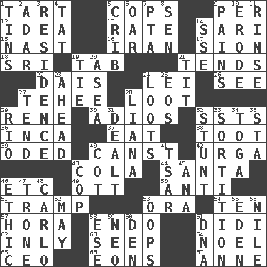 ACROSS 1. Small pie 5. 911 reaches them 9. For each 12. The content of cognition 13. Pace 14. Indian skirt 15. Political cartoonist Thomas 16. SW Asia republic 17. The Jewish people; Israel 18. _ Lanka 19. Bar bill 21. Watches over 22. Raised platform 24. Flowery wreath 26. Observe 27. Giggle 28. Spoils 29. French philosopher Descartes 30. Goodbye (Sp.) 32. Fast planes 36. South American Indian 37. Consume 38. A blast of a horn 39. Wrote a lyric poem 40. 2nd pers. sing. pres. of can (arch.) 42. Capital and largest city of Mongolia 43. Root beer relative 44. Before Barbara or Clara 46. And so on (abbr.) 49. Baseball player Mel 50. Against 51. _____ steamer (cargo ship) 53. Mouth or opening 54. "___ Little Indians" 57. Israeli folk dance 58. Inside; within (prefix) 61. "You Light Up My Life" star Conn 62. Inwardly 63. Ooze 64. Christmas carol 65. Corporate head (abbr.) 66. Immeasurably long periods of time 67. Queen of England 1702-14 DOWN 1. Metal containers 2. The sixth month of the Jewish calendar 3. Dwelling 4. Make lace 5. Baby bed with high sides 6. Boat paddle 7. Parent Teacher Association (abbr.) 8. Elected rep. 9. Aches 10. Wear away 11. Wash lightly 14. Compass dir. 19. Standoff 20. At sea 21. Teat (slang) 23. Forward in time 24. Plunders 25. Greek goddess of the dawn 27. Look after 28. Woody, climbing, usually tropical plant 29. _ de Janeiro 31. Started a card game 32. Check the growth or development of 33. Determination 34. Ancient Roman robe 35. R.R. building 40. Small bed 41. Russian ruler of old 43. Police officer (slang) 45. Santa ___, CA 46. Moral principle 47. Heavy duty weighing machine 48. Monte _, Las Vegas Hotel/Casino 52. Can I? 53. I made a mistake 55. Locale of original sin 56. Mediterranean tributary 58. Compass dir. 59. Modern: prefix 60. Lair 61. Heredity factor (abbr.)