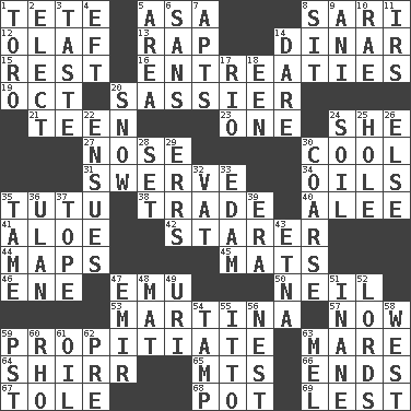 ACROSS 1. False hair 5. White ___ sheet 8. Indian skirt 12. Norwegian king 13. Hit sharply and swiftly 14. Middle Eastern gold or silver currency 15. Repose 16. Pleas 19. Sep. follower 20. More impudent 21. Adolescent 23. Single 24. A female animal or person 27. Olfactory organ 30. Calm and collected 31. Turn aside suddenly 34. Lubricates 35. Ballerina skirt 38. Swap 40. Toward shelter 41. _ vera 42. A viewer who gazes fixedly 44. Atlas contents 45. Floor protectors 46. Compass dir. 47. Australian flightless bird 50. Famous astronaut Armstrong 53. Chrissie's court nemesis 57. At this time 59. Appease 63. Female horse 64. Bake eggs in their shells 65. Mountains (abbr.) 66. Conclusions 67. Lacquered or enameled metalware 68. Cooking vessel 69. For fear that DOWN 1. "Corrida" creature 2. Voters do this 3. Clothes sense 4. Newt 5. Length times width 6. Without 7. Tenement units (abbr.) 8. Be seated 9. Black tropical American cuckoo 10. Actress Charlotte 11. Big collection agency 14. Have the gumption 17. _ de Janeiro 18. Car or cant ending 20. Overwhelm 22. Follows as a consequence or result 24. The visible part of the earth's surface 25. Hollow 26. Otherwise 28. Arrange properly for use 29. Blunders 30. Unrefined 32. Large container 33. Dutch treat 35. Docile 36. ____ Bator 37. Drink excessively 39. Period 43. Inactive volcano in Sicily 47. Independent ruler or chieftain 48. Floor protector 49. RI univ. 51. Empty; void 52. Domineers 54. Pack (down) 55. "Tell ____ the Marines!" 56. Egg locale 58. 270 degrees 59. Pacific Standard Time (abbr.) 60. 17th letter of the Greek alphabet 61. Petroleum 62. Before (prefix) 63. Cartoonist voice _ Blanc