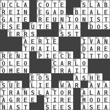 ACROSS 1. Southern CA. univ. 5. ____ d'Azur (French Riviera) 9. Broad, flat, thick piece 13. It's straight from the horse's mouth 14. Mild oath 15. Calif. Air Force Base 16. Yard entry 17. One who advocates reunion 19. Compass dir. 20. Shoshoni 21. "One Day ___ Time" 22. Two (Sp.) 23. Blunders 25. Fast jet (abbr.) 26. Nest on high 30. "Terrible" tsar 34. Go after with the intent to catch 35. Have the gumption 36. Painter Guido (1575-1642) 39. Component 42. "Tell ____ the Marines!" 43. Margarine 44. Monte _, Las Vegas Hotel/Casino 46. Sign of something about to happen 47. Distinguishing feature 48. Greek goddess of the dawn 51. American tennis player Robert 54. Institute legal proceedings 57. Whopper 58. Armed conflict 60. Actress Gardner 62. Interpreter 65. Having or resembling wings 66. Match 67. Hoop that covers a wheel 68. Method 69. Political cartoonist Thomas 70. Observes 71. At sea DOWN 1. Goad 2. Desist 3. 61 cubic inches 4. One (Scot) 5. An absolute certainty 6. Double curve, resembling the letter S 7. The 19th letter of the Greek alphabet 8. Ferber et al. 9. Elected rep. 10. Put down 11. In addition 12. Antes 15. Water vessel 18. ___ a Wonderful Life 20. One who uses or employs something 24. Food allowance for one day 27. Reproach for some lapse or misdeed 28. One more than two 29. Choose 30. Foolish or stupid persons 31. Large container 32. Tate display 33. Modern: prefix 36. Friend of Pooh 37. Shade tree 38. Born 40. Automobile 41. Epoch 45. One who doesn't tell the truth 48. Otherwise 49. Petroleum 50. Theater features 52. Auras 53. Elude 54. Comedian Laurel of Laurel & Hardy 55. Capital and largest city of Mongolia 56. Hearing organs 58. Had on 59. Ancient Greek god of war 61. Type of rug 63. Remaining after all deductions 64. Neckwear 65. Nursemaid (var.)