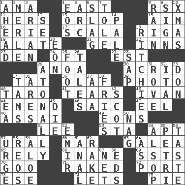 ACROSS 1. Housemaid (var.) 4. 90 degrees 8. Acura sports coupe 11. Possessive pronoun 13. Fourth or lowest deck 15. Direct toward a target or goal 16. One of the Great Lakes 17. Any of the three canals of the cochlea 18. Capital of Latvia 19. Having winglike extensions 21. Set 22. Taverns 23. Lair 24. Often (poetically) 27. Eastern Standard Time (abbr.) 29. Small Philippine buffalo 30. Bitter 34. Make lace 36. Norwegian king 39. Picture 40. Edible starchy tuberous root 41. Rends 43. _ the terrible 44. Make improvements or corrections to 46. Ketch in the Levant 47. Snakelike fish 48. Slender Brazilian palm 49. Immeasurably long periods of time 51. Area sheltered from the wind 53. R.R. building 54. Fitting 57. Mountain range 60. Make imperfect 63. An organ shaped like a helmet 65. Have trust in 66. Empty; void 69. Fast planes 70. Thick or sticky substance 71. Swept the length of 72. Left side of a ship or aircraft 73. Compass dir. 74. Allows 75. Sliced dessert DOWN 1. Forward in time 2. Haggard of country music 3. Believer in; advocate of (suffix) 4. Greek goddess of the dawn 5. Curve 6. Volcanic refuse 7. Lacquered or enameled metalware 8. Water falling in drops from the sky 9. Signal 10. Dec. holiday 12. Arrange properly for use 14. Diluted with white 18. Actors Guy, Robert Welles, and Clint 20. A really long time 25. Lowest support of a structure 26. Falsehoods 28. Plant excrement 29. Lacking a tonal center or key 31. Be footloose 32. Slanted text style (abbr.) 33. Spanish title 34. Scottish caps 35. Ancient Greek god of war 37. Auto club (abbr.) 38. Strips of potato fried in deep fat 40. Afternoon social gathering 42. Highlander 45. Expire 50. Tired old horse 52. Arab leader 54. Columnist Joseph or Stewart 55. _ dish (used to culture cells) 56. Clothes sense 57. Goad 58. Vintage cars 59. Medicinal plant 61. Of or related to the anus 62. Immoral or dissolute person 64. Viper 67. Fish or hair follower 68. Begley and Asner