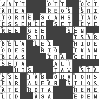 ACROSS 1. Electrical Unit 5. Baseball player Mel 8. Sep. follower 11. Length times width 12. Vintage cars 14. Indian title of respect (Mr.) 15. Singer Mel 17. Fraudulent business schemes 18. Bit 19. Center 21. Put into a specified state 22. Sight organ 23. To separate or throw off 24. Turn to the right 25. Elected rep. 27. To free from 28. Russian ruler of old 31. Actor Lugosi 35. Luau accessory 37. Flintstone garb 38. Lyric poems 39. River (Sp.) 41. _ the terrible 42. Prejudice 43. Lyricist Gershwin 45. An absolute certainty 46. Stalk of a moss capsule 47. The first octave above the treble staff 49. Part of HMS, perhaps 51. The 23rd letter of the Hebrew alphabet 52. R.R. building 55. Compass dir. 57. Keyboard key 60. Speakers 62. Hearing organ 63. Approach 65. Grain storage towers 66. Had dinner 67. Round or rotation of duties 68. French philosopher Descartes 69. Hat (slang) 70. White ___ sheet 71. Locale of original sin DOWN 1. Wetness 2. Came up 3. Laconic 4. Not wild 5. The grampus (Milton) 6. Beverages made from leaves 7. Heavy book 8. Clearly or manifestly demonstrative 9. Supercomputer manufacturer 10. Periodic rise and fall of the sea level 13. Fast planes 16. Engineer (abbr.) 17. Sowing specialist 20. To provide with a ceiling 26. Principle of right and wrong 29. The sixth month of the Jewish calendar 30. Monthly bill 31. Moves up and down 32. Singer Brickell 33. Tough but pliablecoriaceous 34. Slender Brazilian palm 36. One more than two 40. Speaker 44. Having or resembling wings 48. It was, poetically 50. Play the lead 52. Having a sole or soles 53. Heavy duty weighing machine 54. NE Netherlands city 55. Lick closed 56. Suttee (variant) 58. Small Philippine buffalo 59. Wagers 61. Hoop that covers a wheel 64. Auto club (abbr.)