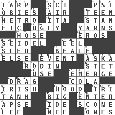 ACROSS 1. Canvas cover 5. _-fi 8. Air pressure measure (abbr.) 11. Off-Broadway awards 13. Wind 14. Adolescent 15. Paris' subway 16. Call ___ day 17. Comedian Laurel of Laurel & Hardy 18. And so on (abbr.) 19. Unsightly 21. Tall tales 22. Stockings 24. Greek god of love 25. A glass for beer 27. Snakelike fish 29. Downhill vehicle 30. Memphis, Tenn. Street 32. Otherwise 33. Incident 35. "____ silly question..." 39. "The Thinker" sculptor 41. Proofreading order 42. Purpose 43. Develop 45. To be drawn or hauled along 48. Root beer relative 49. From or relating to Ireland 50. Parka part 52. Three (prefix) 55. Hyperbolic tangent 56. Massive 57. Keyboard key 59. Domed church section 60. Binary compound 61. Biscuitlike quick bread 62. Area sheltered from the wind 63. Born 64. Washington bills DOWN 1. Heavy book 2. Collude with 3. Actors Guy, Robert Welles, and Clint 4. For each 5. Travel by water 6. Municipality 7. Lyricist Gershwin 8. Stone: prefix 9. Seines 10. Restaurants 12. Lush 14. Russian ruler of old 20. Set 21. Shout 23. More peculiar 25. Compass dir. 26. Pipe bend 27. Car or cant ending 28. Ingest 30. Benjamin's nick name 31. Artist's stand 33. Begley and Asner 34. Compete 36. Ski resort town in Vermont 37. Barrel 38. Had dinner 40. Ending for "Through" and "Enough" 43. Environmental prefix 44. Methods 45. Window treatment 46. Wash lightly 47. American tennis player Robert 49. Slanted text style (abbr.) 50. Flintstone garb 51. Double curve, resembling the letter S 53. French philosopher Descartes 54. Angers 56. Storage container 58. Non-commissioned officer (abbr.)