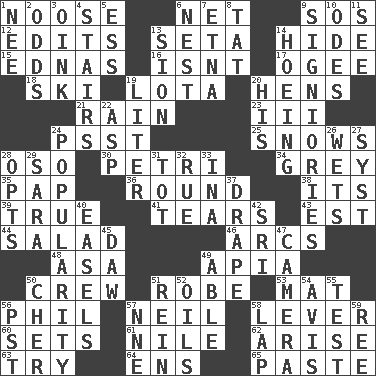 ACROSS 1. Trap for birds or small mammals 6. Fish or hair follower 9. Distress signal 12. Prepares for publication 13. Bristle 14. Flintstone garb 15. Ferber et al. 16. Is not 17. Double curve, resembling the letter S 18. What Jean-Claude Killy likes to do 19. Globular water bottle used in Asia 20. Coop moms 21. Precipitation 23. One more than two 24. Inconspicuous attention getter 25. Frozen precipitation (plural) 28. Bear (Spanish) 30. _ dish (used to culture cells) 34. Jennifer or Joel 35. Infant food 36. Unit of ammunition 38. ___ a Wonderful Life 39. Loyal 41. Rends 43. Eastern Standard Time (abbr.) 44. First course 46. Curves 48. White ___ sheet 49. Capital of Western Samoa 50. Ship's personnel 51. Loose flowing garment 53. Floor protector 56. Silvers or Donahue 57. Famous astronaut Armstrong 58. Prying instrument 60. Puts into a specified state 61. The longest river in the world 62. Ascend 63. Attempt 64. Followers of ems 65. Thick mixture DOWN 1. Born 2. Probability 3. Pig sound 4. Flight of steps 5. Double-curved letter 6. Egg locale 7. Inactive volcano in Sicily 8. Make lace 9. Seigniories (variant) 10. Lyric poems 11. Perceive with the eye 13. The Jewish people; Israel 14. Cultivating 19. 61 cubic inches 20. Part of HMS, perhaps 22. Viper 24. Teen's desire 26. Moistens 27. System (abbr.) 28. Chooses 29. "Two Mules for Sister ____" 31. Small child 32. Regret 33. _ tizzy (2 wds.) 37. Window treatment 40. Artist's stands 42. _ Lanka 45. Fool 47. Device for capturing images 49. Competent 50. "Mermaids" star 51. It's straight from the horse's mouth 52. Petroleums 54. Opinion 55. Trial 56. Pacific Standard Time (abbr.) 57. Compass dir. 58. Infant locale 59. To riddle
