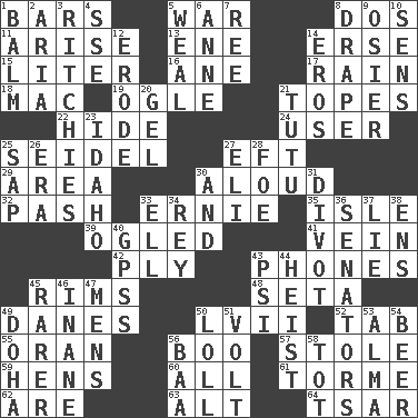 ACROSS 1. Oblong pieces of solid material 5. Armed conflict 8. Two (Sp.) 11. Originate 13. Compass dir. 14. Celtic language 15. 61 cubic inches 16. One (Scot) 17. Precipitation 18. Big _ 19. Stare 21. Drinks excessively 22. Flintstone garb 24. One who uses or employs something 25. Beer mug 27. Bank Draft (abbr.) 29. Type of rug 30. Verbally 32. Romantic infatuation 33. Bert's buddy 35. Small island 39. Stared at amorously 41. Distinctive style or manner 42. Strand of rope, yarn or thread 43. Gives a jingle 45. Basketball hoops 48. Stalk of a moss capsule 49. Natives or inhabitants of Denmark 50. 57 in ancient Rome 52. Keyboard key 55. Northwest Algerian city 56. Sometimes accompanies a hiss 57. Fur scarf 59. Coop moms 60. Everything 61. Singer Mel 62. "We ___ not amused" (Victoria) 63. The first octave above the treble staff 64. Russian ruler of old DOWN 1. Lip ointment 2. Roberta Peters solo 3. Actors Guy, Robert Welles, and Clint 4. Compass dir. 5. Welt 6. Queen of England 1702-14 7. To riddle 8. Window treatment 9. Flexible twig of a willow tree 10. Elected reps. 12. Wear away 14. Greek god of love 20. Set 21. Ballerina skirt 23. Potato state 25. Plant excrement 26. Epoch 27. Connecticut Ivy Leaguer 28. Enemy 30. Also 31. A piece of turf (Scot.) 33. Pipe bend 34. Marina Del _, California 36. Elected representatives 37. Untruth 38. Followers of ems 40. Global Positioning Systems (abbr.) 43. 23rd letter of the Greek alphabet 44. Robbery 45. More uncommon 46. Lacking in sense or substance 47. Not women's 49. Capital of the state of Qatar 50. Hang loosely or laxly 51. Electrical Unit 53. _ mater 54. Fermented drink made from hops 56. Sound made by sheep 58. Small child