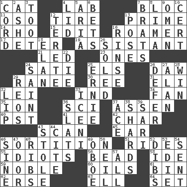 ACROSS 1. Feline 4. Experiment locale 7. Alliance 11. Bear (Spanish) 12. Hoop that covers a wheel 13. A-one 14. 17th letter of the Greek alphabet 15. Prepare for publication 16. Wanderer 17. Prevent from occurring 19. Helper 21. Directed 23. Washington bills 24. Suttee (variant) 25. Raised railways 26. Obsolete 29. Indian princess (variant) 30. To sift 31. Connecticut Ivy Leaguer 32. Luau accessory 33. Working for oneself (abbr.) 34. Avid follower 35. Electrically charged atom 36. _-fi 37. NE Netherlands city 40. Pacific Standard Time (abbr.) 41. Area sheltered from the wind 42. Burn to charcoal 43. Examine minutely or intensely 45. Hearing organ 46. Determination 51. Amusement-park features 55. Foolish or stupid persons 56. Necklace unit 58. Binary compound 59. Impressive in appearance 60. Lubricates 61. Storage container 62. Celtic language 63. Pipe bend 64. Put into a specified state DOWN 1. Drawstring 2. American tennis player Robert 3. A blast of a horn 4. Flaplike covering 5. Roberta Peters solo 6. Antes 7. Naughty children 8. Pale green bean 9. Presage 10. Sure thing 12. Cylindrical with tapered ends 13. Introduce or present, as a question 16. Remove soap 18. Liveliness 20. Having a sole or soles 22. Expire 24. Virtuous person 25. Bert's buddy 26. Put off 27. Actor Alda or Thicke 28. Victory 29. Vintage cars 32. Mouth edge 33. Ancient Celtic tribe of eastern Britain 36. Narrow boards 37. Adept person 38. Broken pieces 39. Indian skirt 43. Took without asking 44. Quote 46. Trig term 47. Aroma 48. Chest bones 49. Mitch Miller's instrument 50. Famous astronaut Armstrong 52. Claim 53. Singer Brickell 54. Emitted 57. Everything