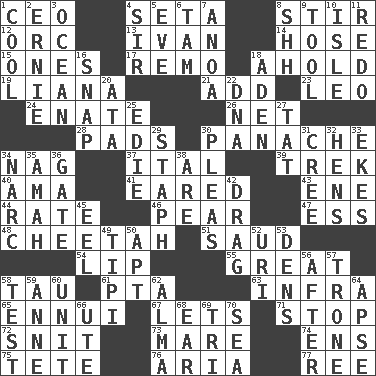 ACROSS 1. Corporate head (abbr.) 4. Stalk of a moss capsule 8. Disorderly outburst 12. The grampus (Milton) 13. _ the terrible 14. Flexible conduit 15. Washington bills 17. San ____ (Riviera town) 18. Hold, grip (Informal) 19. Woody, climbing, usually tropical plant 21. Increase 23. Lion 24. Related on the mother's side 26. Remaining after all deductions 28. Writing tablets 30. Flamboyance 34. Tired old horse 37. Slanted text style (abbr.) 39. Long journey 40. Nanny (var.) 41. Having ears or earlike features 43. Compass dir. 44. Pace 46. Lightbulb-shaped fruit 47. Double-curved letter 48. Leopard's kin 51. Saudi Arabian king (1953-1964) 54. Mouth edge 55. Relatively large 58. The 19th letter of the Greek alphabet 61. Parent Teacher Association (abbr.) 63. Kind of red light 65. World-weariness 67. Allows 71. Obstruct or block passage 72. In a ____ (agitated or irritated) 73. Female horse 74. Followers of ems 75. Wig 76. Roberta Peters solo 77. Portuguese money of account (variant) DOWN 1. Calm and collected 2. Bert's buddy 3. Sea 4. Title for a knight 5. First lady 6. Scottish cap 7. Small Philippine buffalo 8. Quiet! 9. Instrument 10. Small island 11. Do over again 16. Fastener 18. Arabian gulf 20. "One Day ___ Time" 22. Heredity factor (abbr.) 25. Singer Brickell 27. Make lace 29. Staphylococcus 30. Entreaties 31. Algonquian 32. Coop moms 33. Makes supply last 34. Drug cop 35. Wet nurse 36. Yard entry 38. "We ___ not amused" (Victoria) 42. To draw with force 45. Snakelike fish 49. Native american tent (variation) 50. Fitting 52. RI univ. 53. Hiding places for outlaws 56. Following 57. Heavy duty weighing machine 58. Trial 59. Singer Murray 60. A single undivided whole 62. _ mater 64. Domed church section 66. Shoshoni 68. Ewer handle 69. Three (prefix) 70. Ocean