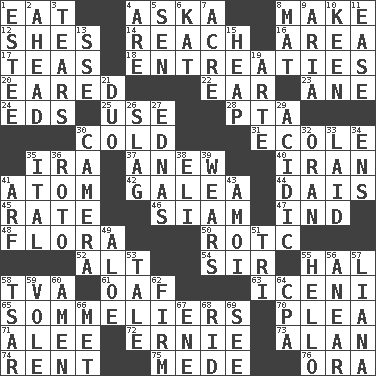 ACROSS 1. Ingest 4. "____ silly question..." 8. Create 12. "______ My Girl" (Turtles hit) 14. Arrive at 16. Length times width 17. Beverages made from leaves 18. Pleas 20. Having ears or earlike features 22. Hearing organ 23. One (Scot) 24. Begley and Asner 25. Purpose 28. Parent Teacher Assoc. 30. Chilled 31. Learning spot: Fr. 35. Lyricist Gershwin 37. Afresh 40. SW Asia republic 41. Tiny particle 42. An organ shaped like a helmet 44. Raised platform 45. Pace 46. Thailand, formerly 47. Indiana (abbr.) 48. Plants 50. College mil. group 52. The first octave above the treble staff 54. Title for a knight 55. Actor Linden 58. Federal power corp. 61. Clumsy lout 63. Ancient Celtic tribe of eastern Britain 65. Wine waiters 70. Entreaty 71. Toward shelter 72. Bert's buddy 73. Actor Alda or Thicke 74. Monthly bill 75. Ancient Persian 76. Mouth or opening DOWN 1. First name in cosmetics 2. Toward the future 3. Pulls into pieces 4. "We ___ not amused" (Victoria) 5. Elected rep. 6. Krazy ___ of comics 7. 1/640 square mile 8. Floor covering 9. Roberta Peters solo 10. Peachy ____! 11. Comfort 13. Compass dir. 15. Pile 19. Johnson of "Laugh-In" 21. Superhero pair 26. Volcanic refuse 27. Ferber et al. 29. Being or containing an acid 30. Device for capturing images 32. NW Algerian seaport 33. Put down 34. Followers of ems 35. Slanted text style (abbr.) 36. Printing process, for short 38. Biblical high priest 39. Erodes 41. Sandy's bark 43. Mine, in Marseilles 49. _ vera 51. Three (prefix) 53. Lie 55. Phone greeting 56. Approach 57. Climbing, woody, usually tropical vines 58. Russian ruler of old 59. Short-tailed, large-bodied rat 60. So be it 62. Securely fixed in place 64. Tax preparer (abbr.) 66. Was introduced to 67. Compass dir. 68. To free from 69. Perceive with the eye