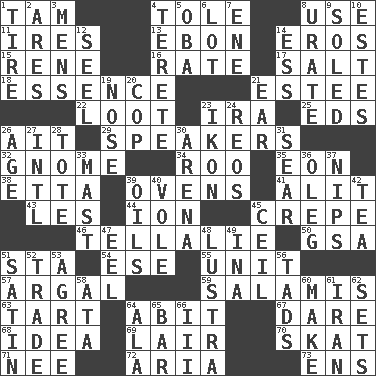 ACROSS 1. Scottish cap 4. Lacquered or enameled metalware 8. Purpose 11. Angers 13. Inky black, to poets 14. Greek god of love 15. French philosopher Descartes 16. Assign a rank or rating to 17. Table seasoning 18. Core 21. First name in cosmetics 22. Spoils 23. Retirement account (abbr.) 25. Begley and Asner 26. Small island 29. Orators 32. Dwarf 34. Friend of Pooh 35. A really long time 38. Singer James 39. Baking chambers 41. Came down and settled, as after flight 43. French article 44. Electrically charged atom 45. Streamer paper 46. Copy Pinocchio 50. Girls' org. (abbr.) 51. R.R. building 54. Compass dir. 55. A single undivided whole 57. Therefore, facetiously 59. Deli grouping 63. Small pie 64. "This won't hurt ____!" 67. Have the gumption 68. The main thing one is thinking about 69. Den 70. Three-handed card game 71. Born 72. Operatic vocal solo 73. Followers of ems DOWN 1. Become fatigued 2. Ancient Greek god of war 3. Not women's 4. Cylindrical with tapered ends 5. Chief or king in Benin or Nigeria 6. Car dealer's back yard 7. Compass dir. 8. A salt of uric acid 9. Having a sole or soles 10. _____ Park, CO 12. Stitch closed the eyes of (a falcon) 14. Curvy letter 19. Characteristic smell of wine 20. Police officer (slang) 21. Ewer handle 23. Image 24. Vintage cars 26. Ripen 27. International (abbr.) 28. Lug 30. Sports stadium 31. Dry up 33. Vertical spar for supporting sails 36. Cassini of fashion 37. Cuts off 39. Lubricates 40. Grand slam 42. Afternoon social gathering 45. To provide with a ceiling 47. Snakelike fish 48. A period of five years 49. _ tizzy (2 wds.) 51. Smooth fabric 52. Swap 53. Match 56. Bits 58. _ moment's notice (2 wds.) 60. Create 61. SW Asia republic 62. Arranges properly for use 64. In the manner of 65. Drinking establishment 66. One more than two