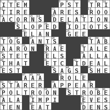 ACROSS 1. A distinct part 5. Pacific Standard Time (abbr.) 8. Three (prefix) 11. Hoop that covers a wheel 12. Ancient Greek god of war 13. Friend of Pooh 14. Oak nuts 17. Conveyance 19. Slanted 21. Foolish or stupid persons 22. Flair 23. Turn to the right 24. Coat; cloak 27. Pismires 29. Bar bill 32. Composer Copland 34. Actress Charlotte 36. Falsehood 37. Proofreading order 38. Raised railways 39. Silent film actress Nazimova 40. Not this but _ 41. And so on (abbr.) 42. Perfect 43. Eastern Standard Time (abbr.) 44. Droops 46. A female animal or person 47. Auto club (abbr.) 50. Hero or heavy, e.g. 52. A viewer who gazes fixedly 55. Become visible 57. Characterized by complete cowardliness 59. Disco prop 62. In the manner of 63. Body of Kaffir warriors 64. Nights before holidays 65. "___ Little Indians" 66. Erode 67. Lairs DOWN 1. Call ___ day 2. Nervous spasm 3. Greek god of love 4. Haggard of country music 5. Before (prefix) 6. Former Milwaukee Brewers owner Bud 7. Sadhe (variant) 8. Musical group of three 9. Carrot, for example 10. Charged particles 12. Increase 15. Pitcher Ryan 16. Connect, as a bridge 18. Standoff 20. Main course 24. Clothes sense 25. Curses 26. Relatively large 28. Table seasonings 29. Lies 30. Assad's deity 31. Memphis, Tenn. Street 33. Baseball player Mel 35. Fortification 36. Small amount or degree 42. Small island 45. Republicans 47. Tate display 48. Nest on high 49. Scent 51. Having ears or earlike features 52. Argument over a trivial matter 53. Lacquered or enameled metalware 54. Actor Alda or Thicke 55. Black tropical American cuckoo 56. Be footloose 58. Elect 60. Benjamin's nick name 61. Double-curved letter