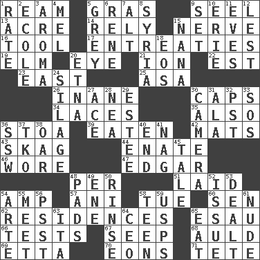 ACROSS 1. 480, 500 or 516 sheets of paper 5. Pate de foie ____ 9. Sew up the eyelids of hawks and falcons 13. 43,560 square feet 14. Have confidence or faith in 15. Effrontery 16. Instrument 17. Pleas 19. Shade tree 20. Sight organ 21. Electrically charged atom 22. Eastern Standard Time (abbr.) 23. Compass direction 25. White ___ sheet 26. Empty; void 30. Smile enhancers 34. Shoestrings 35. In addition 36. Portico 39. Ingested 42. Floor coverings 43. Heroin 44. Related on the mother's side 46. Had on 47. _ Allan Poe 48. For each 51. Put down 54. Electrical Unit 57. Cuckoo 58. Third day of the wk. 60. Elected rep. 62. Homes 65. Son of Isaac 66. Trials 67. Ooze 68. Old (Scot.) 69. Singer James 70. Immeasurably long periods of time 71. False hair DOWN 1. Assign a rank or rating to 2. Learning spot: Fr. 3. Odor 4. Cartoonist voice _ Blanc 5. Jennifer or Joel 6. French philosopher Descartes 7. The first octave above the treble staff 8. Damascus' land 9. Arrange properly for use 10. One of the Great Lakes 11. Nights before holidays 12. For fear that 15. Grandmother 18. Greek goddess of the dawn 20. Inactive volcano in Sicily 24. Fodder prepared in a silo 27. Adept person 28. Teachers' org. 29. First name in cosmetics 30. Device for capturing images 31. Insect wing 32. Pacific Standard Time (abbr.) 33. Distress signal 36. Compass dir. 37. Ring climax 38. Boat paddle 40. Conclusion 41. Tired old horse 45. Lie 48. Groovy apts. 49. Compass dir. 50. Wash lightly 52. Come out of 53. Started a card game 54. Johnson of "Laugh-In" 55. Rendezvous 56. Inconspicuous attention getter 58. Adolescent 59. United States Postal Service (abbr.) 61. Unadorned 63. Call ___ day 64. Corporate head (abbr.) 65. Ingest