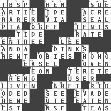 ACROSS 1. Cook's measure (abbr.) 5. Layer 8. Take to court 11. Nick name for Arthur 13. Binary compound 14. 43,560 square feet 15. More uncommon 16. By way of 17. Lick closed 18. Parent Teacher Assoc. 19. Double curve, resembling the letter S 21. Portable shelters 22. Event that recurs at intervals 24. Assign a rank or rating to 25. Main course 27. Area sheltered from the wind 29. Small Philippine buffalo 30. Pig sounds 32. Monthly bill 33. Off-Broadway awards 35. Like (prefix) 39. Artist's stand 41. Baking chamber 42. Period of immesurable duration 43. Cigar-shaped 45. San ____ (Riviera town) 48. One who makes use of a thing 49. Make or become more lively 50. Cy Young winner Saberhagen 52. To free from 55. Wrote a lyric poem 56. Perceive with the eye 57. Elude 59. French philosopher Descartes 60. Shoshoni 61. Eroded 62. Eastern Standard Time (abbr.) 63. Overdraft (abbr.) 64. Beverages made from leaves DOWN 1. Canvas cover 2. Naughty child 3. Ski resort town in Vermont 4. Sliced dessert 5. Hub of activity 6. Singer Brickell 7. Teachers' org. 8. Odor 9. A salt of uric acid 10. Snakelike fish 12. Wear away 14. Toward the sea 20. Unit of force equal to gravity 21. Long journey 23. Feeling or showing extreme anger 25. Hearing organ 26. Compass dir. 27. Falsehood 28. Followers of ems 30. Lubricate 31. Dinah or Pauly 33. Bear (Spanish) 34. Benjamin's nick name 36. Make much ado about nothing 37. Was introduced to 38. Single 40. Period of immesurable duration 43. Third day of the wk. 44. First name in cosmetics 45. Amusement-park features 46. Happening 47. Ancient Persian 49. Old wives' tales, e.g. 50. Stakes 51. Coral collection 53. The content of cognition 54. Habitations of wild animals 56. Player for Phoenix 58. Large container