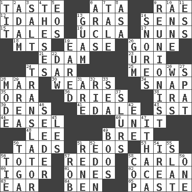 ACROSS 1. Clothes sense 6. _ moment's notice (2 wds.) 9. Actress Charlotte 12. Potato state 13. Pate de foie ____ 14. Elected reps. 15. Lies 16. Southern CA. univ. 17. Religious women 18. Mountains (abbr.) 19. Relaxation 20. Went 21. Dutch treat 23. RI univ. 24. Russian ruler of old 25. Catcalls? 28. Make imperfect 30. Puts on (as clothing) 34. Fastener 35. Mouth or opening 36. Frees from moisture 38. Retirement account (abbr.) 39. Habitations of wild animals 41. Peak District village in England 43. Fast jet (abbr.) 44. Artist's stand 46. A single undivided whole 48. Area sheltered from the wind 49. Cy Young winner Saberhagen 50. Small boys 51. Vintage cars 53. Part of HMS, perhaps 56. Haul 57. Redecorate 58. Monte _, Las Vegas Hotel/Casino 60. Russian composer Stravinsky 61. Washington bills 62. Sea 63. Ewer handle 64. Benjamin's nick name 65. Thick mixture DOWN 1. Teat (slang) 2. First man 3. Table seasoning 4. College papers 5. Greek goddess of the dawn 6. Arches 7. Story 8. White ___ sheet 9. One who advocates reunion 10. Queen of England 1702-14 11. Curvy letter 13. Island territory of the United States 14. Sounds asleep 19. Having ears or earlike features 20. Chewing product 22. Fool 24. Interpreter 26. Armed conflicts 27. Argument over a trivial matter 28. Method 29. Type of rug 31. "We ___ not amused" (Victoria) 32. To free from 33. Ocean 37. Runs notes together 40. Sowing specialist 42. Compass dir. 45. French article 47. New York city 49. Scornful sounds 50. Ancient Roman robe 51. French philosopher Descartes 52. Paradise 54. Angers 55. Narrow board 56. Make a knot 57. Director Reiner 58. Police officer (slang) 59. Single