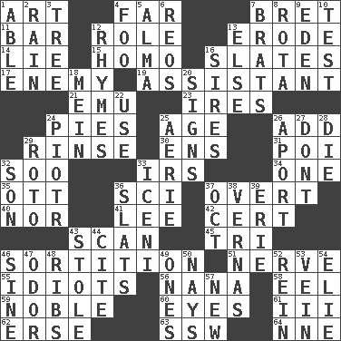 ACROSS 1. Tate display 4. At a great distance 7. Cy Young winner Saberhagen 11. Tavern 12. Hero or heavy, e.g. 13. Eat (away) 14. Untruth 15. Same (prefix) 16. Chalkboards 17. Foe 19. Aide 21. Australian flightless bird 23. Angers 24. Sliced desserts 25. Ripen 26. Find the sum of 29. Wash lightly 30. Followers of ems 31. Luau course 32. "Barney Miller" actor Jack 33. Big collection agency 34. Single 35. Baseball player Mel 36. _-fi 37. Unconcealed 40. Not either 41. Area sheltered from the wind 42. Foregone conclusion 43. Glance over 45. Three (prefix) 46. Making a chance decision by using lots 51. Boldness 55. Foolish or stupid persons 56. Grandmother 58. Snakelike fish 59. Having high moral qualities 60. Sight organs 61. One more than two 62. Celtic language 63. Compass dir. 64. Compass dir. DOWN 1. Competent 2. Water falling in drops from the sky 3. Relationship diagram 4. Egg _ yung 5. _ mater 6. Vintage cars 7. Naughty children 8. Roll call or roster of names 9. Locale of original sin 10. Trial 12. Poems 13. Otherwise 16. Male parents of animals 18. Count _ (2 wds.) 20. Omens 22. Purpose 24. Peter (Polish) 25. Nest on high 26. To the left, to Queeg 27. Do not 28. Expire 29. Printing process, for short 32. Male child 33. Ancient Celtic tribe of eastern Britain 36. Narrow boards 37. Sep. follower 38. Actresses Bloom and Felton 39. 4th largest of the Great Lakes 43. Took without asking 44. Quote 46. Trig term 47. Scent 48. Teases 49. Singles 50. Negative votes 52. It's straight from the horse's mouth 53. Distinctive style or manner 54. Writer Wiesel 57. ___ Haven, CT