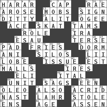 ACROSS 1. Ethiopian city, capital of Harari 6. Head covering 9. Actress Charlotte 12. Came up 13. Crowds into 14. Omen 15. Simple song 16. Set down 17. Double curve, resembling the letter S 18. Adept person 19. Three-handed card game 20. Scottish caps 21. Hero or heavy, e.g. 23. Lyricist Gershwin 24. He sold his birthright 25. Laconic 28. Groovy apt. 30. Strips of potato fried in deep fat 34. Dormintory (informal) 35. Black tropical American cuckoo 36. Grain storage towers 38. Cards in a Roman deck? 39. Ear part 41. Come out of 43. Eastern Standard Time (abbr.) 44. Shopping centers 46. Angers 48. Connecticut Ivy Leaguer 49. Slanted text style (abbr.) 50. A single undivided whole 51. Sinks 53. Car or cant ending 56. Butter sub 57. In addition 58. Bitter 60. Political cartoonist Thomas 61. Cowardly lion portrayer 62. Took without asking 63. Followers of ems 64. Mature 65. NE Netherlands city DOWN 1. Possessed 2. Roberta Peters solo 3. College mil. group 4. Michaelmas daisies 5. Marina Del _, California 6. Root beer relative 7. "This won't hurt ____!" 8. Pacific Standard Time (abbr.) 9. Complicated, petty procedures 10. Ripens 11. Compass dir. 13. Cause to be 14. Flew 19. Runs notes together 20. Teat (slang) 22. Clumsy lout 24. The property of being fit to eat 26. Indian titles of respect 27. Send forth 28. Inside of hand 29. Small Philippine buffalo 31. One more than two 32. Raised railways 33. Distress signal 37. Costumes for special activities 40. American author Paul (1891-1958) 42. Period 45. Be seated 47. Opts 49. Russian composer Stravinsky 50. ____ Bator, Mongolia 51. Volcanic refuse 52. American tennis player Robert 54. Greek god of love 55. The longest river in the world 56. Single 57. In the manner of 58. White ___ sheet 59. Lair