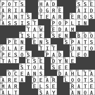ACROSS 1. Plant holders 5. Possessed 8. Compass dir. 11. Operatic vocal solo 12. Legendary monster 14. Assist 15. Leg coverings 17. Rend 18. Greek god of love 19. Aid 21. Cotton for raincoats, e.g. 23. The 23rd letter of the Hebrew alphabet 25. Dutch treat 26. Small island 27. Elected rep. 28. Sometimes accompanies a hiss 31. Fenced enclosure 33. Followers of ems 35. Arguments over trivial matters 37. Norwegian king 38. Teat (slang) 40. To (old English) 41. Mexican monetary units 43. Writing tablet 45. Lion 46. Make lace 47. Compass dir. 50. Unit of force 52. Portico 53. Observe 54. Seas 56. A pale violet or amethyst color 61. Length times width 62. Letter starter 65. Plunders 66. Third mo. 67. Otherwise 68. Pace 69. Keyboard modifier key 70. Declare 71. Small Philippine buffalo DOWN 1. Dad 2. Mouths or openings 3. Airtight sealed metal containers 4. Suttee (variant) 5. Being at a high temperature 6. Ripen 7. Window treatments 8. Indian skirt 9. The Jewish people; Israel 10. Begley and Asner 13. Eat (away) 16. Fast planes 18. Shade tree 20. Lie 22. Baking dishes 24. Gone 26. Information 28. Object of repulsion 29. Von Bismarck 30. Bear (Spanish) 31. Entreaty 32. Compass direction 34. Small drink 36. Whine 37. Elect 39. Bits 42. Bristle 44. Colored 48. Message 49. Artist's stands 51. Actress Patricia 52. Ocean 54. Relating to the mouth 55. Certainty 57. Israeli folk dance 58. Grant temporary use of 59. "Tell ____ the Marines!" 60. At sea 61. Housemaid (var.) 63. White ___ sheet 64. Marina Del _, California