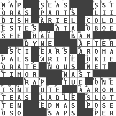 ACROSS 1. Atlas unit 4. Oceans 8. Fast jet (abbr.) 11. Mouths or openings 13. Pieces 15. Cards in a Roman deck? 16. Food container 17. Satellite of Uranus 18. Chilled 19. _____ Park, CO 21. "One Day ___ Time" 22. Mitch Miller's instrument 23. Perceive with the eye 24. Actor Linden 27. Bar 29. Unit of force 30. Following 34. _-fi 36. Hearing organs 39. Scent 40. Friends 41. Compose 43. Migrant worker of the '30s 44. Speak pompously 46. Good sense 47. Fish or hair follower 48. Southeast Indonesia island 49. Political cartoonist Thomas 51. Strike 53. Third day of the wk. 54. Single 57. Is not 60. Shoshoni 63. Composer Copland 65. Afternoon social gatherings 66. Dipping utensil 69. Narrow opening 70. "___ Little Indians" 71. Ferber et al. 72. Airs 73. Bear (Spanish) 74. Plant excrements 75. For each DOWN 1. Methods 2. Ascend 3. Thick mixture 4. Health resort 5. Hearing organ 6. Roberta Peters solo 7. Proofreading order 8. Oscar Madison type 9. Grain storage tower 10. Event that recurs at intervals 12. A female animal or person 14. Thick slice 18. Meet 20. Like a shrinking violet 25. Afresh 26. Acquire or gain knowledge or skills 28. American Automobile Association (abbr.) 29. What propaganda does 31. Puff or smoke 32. Send forth 33. Actress Charlotte 34. Indian skirt 35. Dollar (slang) 37. _ de Janeiro 38. Difficult or unusual or dangerous feat 40. Plant holder 42. He sold his birthright 45. Epoch 50. Ocean 52. Whimper 54. Lowest deck of a ship 55. Trap for birds or small mammals 56. Keyboard key 57. "Tell ____ the Marines!" 58. Perceives with the eye 59. Billionth: prefix 61. Bits 62. Pulitzer Prize-winning author Ferber 64. Viper 67. Infant locale 68. Double-curved letter