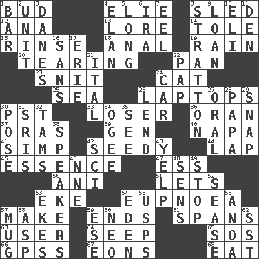 ACROSS 1. Partially opened flower 4. Writer Wiesel 8. Downhill vehicle 12. Santa ___, CA 13. Old wives' tales, e.g. 14. Lacquered or enameled metalware 15. Wash lightly 18. Of or related to the anus 19. Water falling in drops from the sky 20. Pulling apart 22. Baking dish 23. In a ____ (agitated or irritated) 24. Domesticated feline 25. Ocean 26. Portable computers 30. Pacific Standard Time (abbr.) 33. Failure 36. NW Algerian seaport 37. Mouths or openings 39. Commissioned mil. rank 40. California wine valley 41. Simple or foolish person 42. Morally degraded 44. Pet locale 45. Core 47. Curvy letter 50. Black tropical American cuckoo 51. Allows 53. Supplement with great effort 54. Normal relaxed breathing 57. Create 59. Extremities 61. Connects, as a bridge 63. One who uses or employs something 64. Ooze 65. Mayday 66. Global Positioning Systems (abbr.) 67. Immeasurably long periods of time 68. Erode DOWN 1. Long, evenly shaped piece 2. A single undivided whole 3. Natives or inhabitants of Denmark 4. Enthusiasm 5. Yearn 6. Lyricist Gershwin 7. Snakelike fish 8. Ski resort town in Vermont 9. Grant temporary use of 10. Biblical high priest 11. Lair 16. Without 17. One of the Great Lakes 21. Slanted text style (abbr.) 22. Infant food 24. Automobile 26. Grant temporary use of 27. Of the mouth 28. Dad 29. Fastener 30. Introduce or present, as a question 31. Indian titles of respect 32. Scottish caps 34. Double curve, resembling the letter S 35. Observe 38. Orators 42. _-fi 43. Sharp bark 46. Compass dir. 48. Elected reps. 49. Close up, plug up 52. Gospel singer Marvin 53. Supplements with great effort 54. Genesis locale 55. United States Postal Service (abbr.) 56. Small Philippine buffalo 57. Large cup 58. Cleo's killer 59. Compass dir. 60. Modern: prefix 62. Fast jet (abbr.)