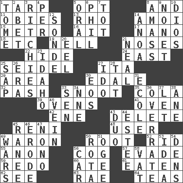 ACROSS 1. Canvas cover 5. Elect 8. Also 11. Off-Broadway awards 13. 17th letter of the Greek alphabet 14. Mine, in Marseilles 15. Paris' subway 16. Small island 17. Billionth: prefix 18. And so on (abbr.) 19. 1994 drama film starring Jodie Foster 21. Olfactory organs 22. Flintstone garb 24. Compass direction 25. A glass for beer 27. Call ___ day 29. Length times width 30. Peak District village in England 32. Romantic infatuation 33. Snob 35. Root beer relative 39. Baking chambers 41. Baking chamber 42. Compass dir. 43. Erase 45. Painter Guido (1575-1642) 48. One who uses or employs something 49. Make _____ (do battle with) 50. Carrot, for example 52. To free from 55. At once, immediately (arch.) 56. Gear tooth 57. Elude 59. Redecorate 60. Had dinner 61. Ingested 62. Observe 63. Actress Charlotte 64. Afternoon social gatherings DOWN 1. Heavy book 2. Collude with 3. Actors Guy, Robert Welles, and Clint 4. For each 5. Relating to the mouth 6. Silvers or Donahue 7. Small child 8. Collect or gather 9. Music written for nine 10. "Vaya con ____" 12. Message 14. Small Philippine buffalo 20. Snakelike fish 21. Anneal 23. Potato state 25. Plant excrement 26. Period 27. Wedding promise 28. Make lace 30. Greek goddess of the dawn 31. Learning spot: Fr. 33. Elected rep. 34. Compass dir. 36. Make much ado about nothing 37. Allow 38. One (Scot) 40. Distinctive style or manner 43. Superhero pair 44. First name in cosmetics 45. The wife of a rajah (variant) 46. Eat (away) 47. Words to Nanette 49. Armed conflicts 50. Round or rotation of duties 51. Double curve, resembling the letter S 53. The content of cognition 54. Lairs 56. Auto 58. Large container