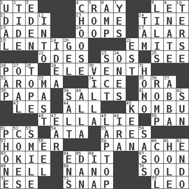 ACROSS 1. Shoshoni 4. Supercomputer manufacturer 8. Allow 11. "You Light Up My Life" star Conn 13. Dwelling 14. Prong on a fork 15. Arabian gulf 16. I made a mistake 17. Having or resembling wings 18. Small, flat, pigmented spot on the skin 21. Sends forth 22. Lyric poems 23. Distress signal 25. Observe 26. Cooking vessel 29. Veterans Day date 32. Scent 34. Frozen water 35. Mouth or opening 38. Dad 39. Table seasonings 41. Crowds into 43. French article 44. 100% 45. Dried seaweed eaten as food 46. Copy Pinocchio 50. Baking dish 51. Personal Computers (abbr.) 54. "One Day ___ Time" 55. Ancient Greek god of war 57. Homing pigeon 59. Flamboyance 63. Migrant worker of the '30s 64. Prepare for publication 67. Within a short period 68. 1994 drama film starring Jodie Foster 69. Billionth: prefix 70. Disposed of to a purchaser 71. Compass dir. 72. Fastener 73. Lion DOWN 1. Freehold land 2. Event that recurs at intervals 3. Locale of original sin 4. Opt 5. Friend of Pooh 6. Electrical Unit 7. Affirmative reply 8. Ms. Damita and namesakes 9. Maternal 10. Laconic 12. To the inside or interior of 14. Scottish cap 19. It may be bright or harebrained 20. Set 21. Eastern Standard Time (abbr.) 23. Religious group 24. Washington bills 26. Infant food 27. Taken by mouth 28. Drink excessively 30. Country estate 31. Same (prefix) 33. Vertical spar for supporting sails 36. Frolic 37. Swedish rock group 39. Table seasoning 40. Silent film actress Nazimova 42. Player for Phoenix 45. Peachy ____! 47. Ewer handle 48. Portable computer 49. Lyricist Gershwin 51. Give a jingle 52. Popular sodas 53. Grin 56. Backtalk 58. Snakelike fish 60. Calm and collected 61. Hollow 62. Inside; within (prefix) 64. Followers of ems 65. Daniel's nick name 66. _ tizzy (2 wds.)