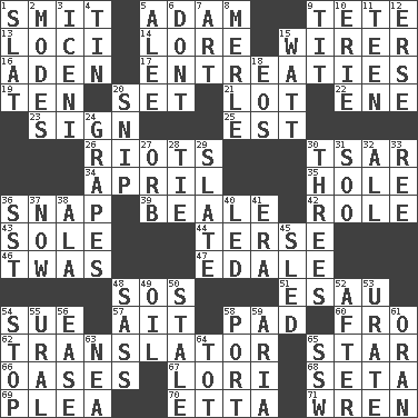 ACROSS 1. Stricken, poetically 5. First of billions? 9. False hair 13. Locales 14. Old wives' tales, e.g. 15. One who wires 16. Arabian gulf 17. Pleas 19. Nine, plus one 20. Arrange properly for use 21. Car dealer's back yard 22. Compass dir. 23. Public display of a written message 25. Eastern Standard Time (abbr.) 26. Disturbances 30. Russian ruler of old 34. Showery time 35. Opening into or through something 36. Fastener 39. Calif. Air Force Base 42. Hero or heavy, e.g. 43. Not divided or shared with others 44. Laconic 46. It was, poetically 47. Peak District village in England 48. Mayday 51. Son of Isaac 54. Take to court 57. Small island 58. Groovy apt. 60. Away 62. Interpreter 65. Play the lead 66. Fertile tracts in a desert 67. Australian parrot (variant) 68. Stalk of a moss capsule 69. Entreaty 70. Singer James 71. Songbird DOWN 1. Narrow board 2. Methods 3. Ancient Celtic tribe of eastern Britain 4. Metal container 5. Toward shelter 6. Do not 7. Tate display 8. Haggard of country music 9. Teat (slang) 10. One of the Great Lakes 11. Adolescent 12. Celtic language 15. Electrical Unit 18. Greek goddess of the dawn 20. Clip 24. Raisin fruits 27. Globe 28. Make a knot 29. Chalkboard 30. Trios 31. "Barney Miller" actor Jack 32. Everything 33. To separate or throw off 36. Fast jet (abbr.) 37. At this time 38. Insect wing 40. Directed 41. Period 45. Downhill vehicle 48. Backtalk 49. Lubricate 50. Lacking originality or spontaneity 52. Following 53. A salt of uric acid 54. Cease 55. Mountain range 56. Comfort 58. Sweet dark-red dessert wine 59. Operatic vocal solo 61. Northwest Algerian city 63. Teachers' org. 64. Small child 65. Compass dir.