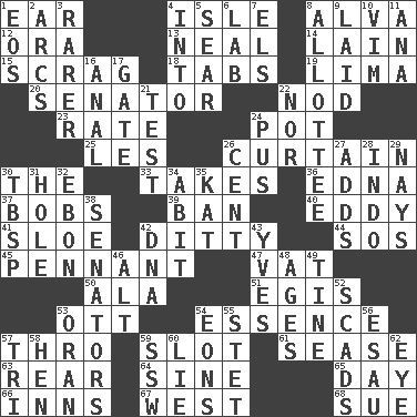 ACROSS 1. Ewer handle 4. Small island 8. Inventor's middle name 12. Mouth or opening 13. Actress Patricia 14. (Had) reclined 15. Strangle with an iron collar 18. Bar bills 19. Pale green bean 20. Legislator 22. Lower and raise head in agreement 23. Assign a rank or rating to 24. Cooking vessel 25. French article 26. Window treatment 30. Definite Article 33. Receives possession of 36. Pulitzer Prize-winning author Ferber 37. Moves up and down 39. Bar 40. Whirlpool 41. _ gin 42. Short, simple song 44. Distress signal 45. Pre-World Series prize 47. Large container 50. According to 51. Armor plate that protects the chest 53. Baseball player Mel 54. Center 57. Through, poetically 59. Narrow, elongated depression 61. Gospel singer Marvin 63. Hitchcock's "____ Window" 64. Trig term 65. 24 hours 66. Restaurants 67. Compass direction 68. Take to court DOWN 1. Greek goddess of the dawn 2. Curves 3. Less widely known 4. To the inside or interior of 5. Dry up 6. Experiment locale 7. Raised railways 8. One to whom something is allotted 9. Put down 10. Zeal 11. Santa ___, CA 16. Of or related to the anus 17. Yard entry 21. Trial 22. And not 24. Product of festering 26. Penny 27. Does sums 28. _ china 29. Negative votes 30. Cook's measure (abbr.) 31. Hollow 32. Inky black, to poets 34. "This won't hurt ____!" 35. Krazy ___ of comics 38. Legislators 42. Heredity factor (abbr.) 43. Jacques Cousteau's middle name 46. Keyboard modifier key 48. Matures 49. Prong on a fork 52. Tons 53. NW Algerian seaport 54. Immeasurably long periods of time 55. Proofreading order 56. Son of Isaac 57. Three (prefix) 58. Layer 59. Compass dir. 60. Untruth 62. Sight organ