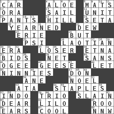 ACROSS 1. Auto 4. _ vera 8. Floor coverings 12. Mouth or opening 13. Move on water 14. A single undivided whole 15. Leg coverings 18. Land elevation 19. Stalk of a moss capsule 20. Felt deep pity or tenderness 22. Morning condensation 23. 4th largest of the Great Lakes 24. Yet 25. 23rd letter of the Greek alphabet 26. Of or relating to Laos or its people 30. Period 33. Failure 36. Inactive volcano in Sicily 37. Auction offers 39. Remaining after all deductions 40. Without 41. Double curve, resembling the letter S 42. Honkers 44. Allow 45. Fools 47. Spanish title 50. One (Scot) 51. Christmas carol 53. "One Day ___ Time" 54. Paper fasteners 57. _ china 59. Musical group of three 61. Killed 63. Letter starter 64. _ and Stitch 65. Friend of Pooh 66. Hearing organs 67. Calm and collected 68. Compass dir. DOWN 1. Police officer (slang) 2. Like ___ of sunshine 3. Indian princess (variant) 4. American tennis player Robert 5. Put down 6. Petroleum 7. Pipe bend 8. French bagpipes 9. Afresh 10. Teat (slang) 11. R.R. building 16. Canvas cover 17. Indian titles of respect 21. Famous astronaut Armstrong 22. Superhero pair 24. Long, evenly shaped piece 26. Allows 27. Slanted text style (abbr.) 28. Singer Murray 29. Political cartoonist Thomas 30. Inky black, to poets 31. Swiss mountan, "Queen of the Mountains" 32. An important port of Yemen 34. Singles 35. Perceive with the eye 38. Legislators 42. Turn to the right 43. Pulitzer Prize-winning author Ferber 46. _ tizzy (2 wds.) 48. I made a mistake 49. 1994 drama film starring Jodie Foster 52. Memorize 53. The sixth month of the Jewish calendar 54. Grain storage tower 55. Utensil 56. The Jewish people; Israel 57. Binary compound 58. Teachers' org. 59. Affectionate concern, for short 60. River (Sp.) 62. At this time
