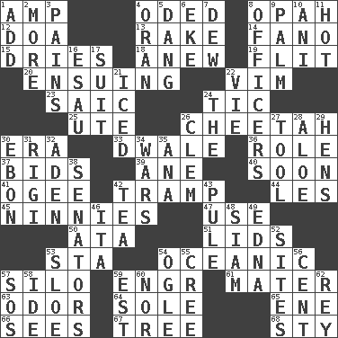 ACROSS 1. Electrical Unit 4. Wrote a lyric poem 8. Brightly colored fish 12. ___ good deed 13. Immoral or dissolute person 14. Papal veil 15. Frees from moisture 18. Afresh 19. Sudden quick movement 20. Following as a consequence or result 22. Zeal 23. Ketch in the Levant 24. Nervous spasm 25. Shoshoni 26. Leopard's kin 30. Epoch 33. A sleeping potion; an opiate (poet.) 36. Hero or heavy, e.g. 37. Auction offers 39. A saturated hydrocarbon 40. Within a short period 41. Double curve, resembling the letter S 42. _____ steamer (cargo ship) 44. French article 45. Simpletons 47. Purpose 50. "One Day ___ Time" 51. Hats (slang) 53. R.R. building 54. Pertaining to the sea 57. Grain storage tower 59. Engineer (abbr.) 61. Mother 63. Scent 64. Flatfish 65. Compass dir. 66. Perceives with the eye 67. Family _ (genealogy) 68. Filthy place DOWN 1. Find the sum of 2. Greater amount 3. Aches 4. Northwest Algerian city 5. Mild oath, euphamism for damn 6. Supplement with great effort 7. Morning condensation 8. Persons of authority 9. Inside of hand 10. Cuckoo 11. Being at a high temperature 16. He sold his birthright 17. Costume for a special activity 21. On the rocks 22. Compete 24. Definite Article 26. Clement's nick name 27. Implement 28. _ vera 29. Coop moms 30. Inky black, to poets 31. Swiss mountan, "Queen of the Mountains" 32. Arabian gulf 34. Armed conflicts 35. Santa ___, CA 38. Legislators 42. Beverage made from leaves 43. Whimper 46. Call ___ day 48. Thailand, formerly 49. Pulitzer Prize-winning author Ferber 52. Settings 53. _ gin 54. Stare at amorously 55. Algonquian 56. Penny 57. Distress signal 58. Binary compound 59. Eastern Standard Time (abbr.) 60. Not either 62. Marina Del _, California