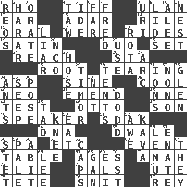 ACROSS 1. 17th letter of the Greek alphabet 4. Small quarrel 8. ____ Bator, Mongolia 12. Hearing organ 13. The sixth month of the Jewish calendar 14. Cause heat under the collar 15. Taken by mouth 17. We are 18. Amusement-park features 19. Smooth fabric 21. Superhero pair 23. Put into a specified state 24. Arrive at 26. R.R. building 28. Carrot, for example 30. Rending 34. Cleo's killer 37. Trig term 39. Calm and collected 40. Modern: prefix 41. Make improvements or corrections to 43. Compass dir. 44. Trial 46. "Beetle Bailey" pooch 47. Male child 48. Orator 51. Neighbor of Neb. 54. Heredity factor (abbr.) 55. A sleeping potion; an opiate (poet.) 58. Health resort 61. And so on (abbr.) 63. Incident 65. Eating place 67. Eras 71. Wet nurse 72. Writer Wiesel 73. Friends 74. Shoshoni 75. Wig 76. In a ____ (agitated or irritated) 77. Marina Del _, California DOWN 1. Vintage cars 2. Ethiopian city, capital of Harari 3. Declaim 4. The 23rd letter of the Hebrew alphabet 5. Binary compound 6. At a great distance 7. Flintstone 8. RI univ. 9. Hats (slang) 10. Toward shelter 11. A home for chicks 16. One who doesn't tell the truth 18. Round or rotation of duties 20. Non-commissioned officer (abbr.) 22. Purpose 25. Stockings 27. Curve 29. The easternmost of the Lesser Sundas 30. Portable shelters 31. Charged particles 32. Words to Nanette 33. Small, secluded valley 34. Pismires 35. Ooze 36. Introduce or present, as a question 38. Remaining after all deductions 42. Texas town _ City 45. Small boy 49. Leg joint 50. Erode 52. Deep reverence 53. Polynesian shrub of the pepper family 56. Arboreal primate 57. Maternal 58. Proofreading order 59. Light colored 60. "This won't hurt ____!" 62. Balmoral and tarboosh 64. Those things 66. Area sheltered from the wind 68. Separate the seeds from cotton 69. Connecticut Ivy Leaguer 70. Fast jet (abbr.)