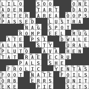 ACROSS 1. _ and Stitch 5. "Barney Miller" actor Jack 8. Single 11. Arabian gulf 12. Small pie 14. Male parent 15. Distance measurement 17. Type of rug 18. I made a mistake 19. Went by 21. A period of five years 23. Tired old horse 25. Blemish 26. Frolic 27. Snakelike fish 28. Large cup 31. Had dinner 33. 23rd letter of the Greek alphabet 35. A sleeping potion; an opiate (poet.) 37. Actor Alda or Thicke 38. Filthy place 40. Mountain range 41. Cartoon dog 43. Actress Gardner 45. Layer 46. Make lace 47. Actress Charlotte 50. Shade of tan 52. Friends 53. A female animal or person 54. Play 56. Gossips 61. Lowest support of a structure 62. Nathan's nickname 65. Fencing necessities 66. Globe 67. Blunders 68. A single undivided whole 69. Supplement with great effort 70. Sliced dessert 71. Puts into a specified state DOWN 1. Desk light 2. The content of cognition 3. Allows 4. Washington bills 5. R.R. building 6. Rowing implement 7. Threatening words 8. Scent 9. California wine valley 10. Begley and Asner 13. Grayish beige 16. Former U.S. Attorney General Janet 18. Baseball player Mel 20. Moist 22. Exchanged or delivered for money 24. Global Positioning Systems (abbr.) 26. Monthly bill 28. Female horse 29. ____ Bator 30. Set 31. Silent film actress Nazimova 32. Pulled tight 34. Call ___ day 36. Chinese city south-southwest of Nanjing 37. Fitting 39. Jacques Cousteau's middle name 42. Taken by mouth 44. Painful 48. Place in a line 49. Fortification 51. Coral ridge 52. Cooking vessel 54. Tined utensil 55. Loose flowing garment 57. Good sense 58. Prong on a fork 59. Came down and settled, as after flight 60. Fast planes 61. Enemy 63. Three (prefix) 64. Compass dir.