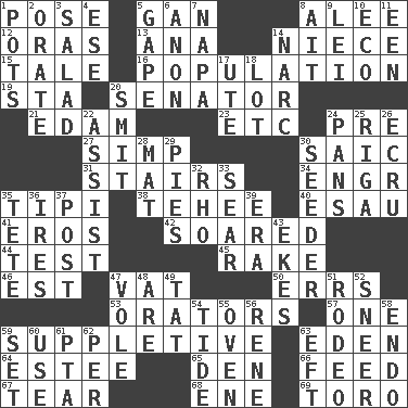 ACROSS 1. Airs 5. Separate the seeds from cotton 8. Toward shelter 12. Mouths or openings 13. Santa ___, CA 14. Sibling's daughter 15. Story 16. Census information 19. R.R. building 20. Elected representative 21. Dutch treat 23. And so on (abbr.) 24. Before (prefix) 27. Simple or foolish person 30. Ketch in the Levant 31. Flight of steps 34. Engineer (abbr.) 35. Native american tent (variation) 38. Giggle 40. Son of Isaac 41. Greek god of love 42. Flew 44. Trial 45. Immoral or dissolute person 46. Eastern Standard Time (abbr.) 47. Large container 50. Blunders 53. Speakers 57. Single 59. Supplying deficiencies 63. Genesis locale 64. First name in cosmetics 65. Lair 66. Nourish 67. Rend 68. Compass dir. 69. "Corrida" creature DOWN 1. Plant holders 2. Declaim 3. First course 4. Compass dir. 5. Yawn 6. At once, immediately (arch.) 7. California wine valley 8. Small island 9. Flowery wreath 10. Environmental prefix 11. Car or cant ending 14. Drug cop 17. Shoshoni 18. Car dealer's back yard 20. Stricken, poetically 22. Aid 24. Baking dishes 25. Port city in Latvia 26. Shade of tan 28. Floor protector 29. Sliced desserts 30. Sowing specialist 32. 17th letter of the Greek alphabet 33. Shrivel 35. False hair 36. Angers 37. Mail 39. Epoch 43. Supplements with great effort 47. Grand slam 48. "We ___ not amused" (Victoria) 49. Make lace 51. Cowboy competition 52. Contemptuous expression 54. Event that recurs at intervals 55. Baking chamber 56. French philosopher Descartes 58. Inside; within (prefix) 59. Arrange properly for use 60. Purpose 61. Parent Teacher Association (abbr.) 62. For each 63. Bank Draft (abbr.)