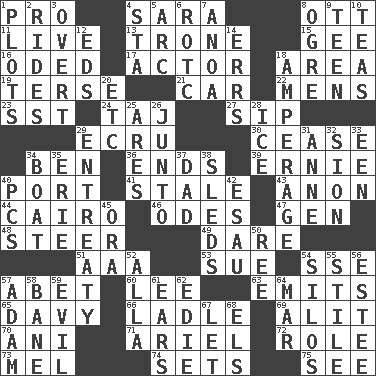 ACROSS 1. Adept person 4. "Two Mules for Sister ____" 8. Baseball player Mel 11. Moving, as bait 13. Heavy duty weighing machine 15. Turn to the right 16. Wrote a lyric poem 17. Thespian 18. Length times width 19. Laconic 21. 4-wheeled motor vehicle 22. Not women's 23. Fast jet (abbr.) 24. _ Mahal 27. Small drink 29. Shade of tan 30. Desist 34. Benjamin's nick name 36. Extremities 39. Bert's buddy 40. Left side of a ship or aircraft 41. Showing deterioration from age 43. Soon (poet.) 44. Capital of Egypt 46. Lyric poems 47. Commissioned military rank (abbr.) 48. Guide 49. Have the gumption 51. American Automobile Association (abbr.) 53. Institute legal proceedings 54. Compass dir. 57. Collude with 60. Area sheltered from the wind 63. Gives off 65. American folk hero Crockett 66. Dipping utensil 69. Came down and settled, as after flight 70. Cuckoo 71. Satellite of Uranus 72. Hero or heavy, e.g. 73. Cartoonist voice _ Blanc 74. Puts into a specified state 75. Observe DOWN 1. Graphs 2. Amusement-park features 3. Unconcealed 4. R.R. building 5. Curve 6. College mil. group 7. Small Philippine buffalo 8. Legendary monster 9. Adolescent 10. Afternoon social gatherings 12. Begley and Asner 14. Blunders 18. Electrical Measurement 20. And so on (abbr.) 25. Ancient Greek god of war 26. Secret group 28. Frozen water 29. Plea 31. Queen of England 1702-14 32. The Jewish people; Israel 33. Car or cant ending 34. Water vessel 35. One of the Great Lakes 37. Male parent 38. Bobsleighs 40. Personal Computers (abbr.) 42. Son of Isaac 45. Mouth or opening 50. To sift 52. Silent film actress Nazimova 54. Grain storage towers 55. Vertical member of a panel or frame 56. First name in cosmetics 57. First man 58. Object of repulsion 59. Tending to cause great harm 61. Hearing organs 62. Singer Brickell 64. Third mo. 67. Allow 68. Raised railways