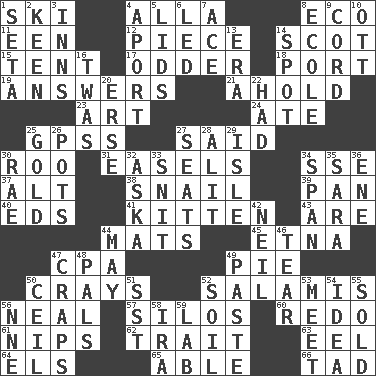 ACROSS 1. What Jean-Claude Killy likes to do 4. Silent film actress Nazimova 8. Environmental prefix 11. Car or cant ending 12. Component 14. Native of Scotland 15. Portable shelter 17. More peculiar 18. Sweet dark-red dessert wine 19. Replies 21. Hold, grip (Informal) 23. Tate display 24. Had dinner 25. Global Positioning Systems (abbr.) 27. Alleged 30. Friend of Pooh 31. Artist's stands 34. Compass dir. 37. The first octave above the treble staff 38. Slow-paced one 39. Baking dish 40. Begley and Asner 41. Baby cat 43. "We ___ not amused" (Victoria) 44. Floor coverings 45. Inactive volcano in Sicily 47. Numbers guy (abbr.) 49. Sliced dessert 50. Trading vessels 52. Deli grouping 56. Be tempered by heat 57. Grain storage towers 60. Do over again 61. Pinches, bites 62. Distinguishing feature 63. Snakelike fish 64. Raised railways 65. Competent 66. Bit DOWN 1. Stalk of a moss capsule 2. Peachy ____! 3. Restaurants 4. To the left, to Queeg 5. Hats (slang) 6. Directed 7. Adept person 8. Learning spot: Fr. 9. Drawstring 10. Baseball player Mel 13. Epoch 14. Specific locale 16. It was, poetically 20. Celtic language 22. Possessed 25. Gilded 26. Plant holders 27. Theater features 28. Came down and settled, as after flight 29. Capri or Wight 30. Actress Charlotte 32. "____ silly question..." 33. In a ____ (agitated or irritated) 34. Connect, as a bridge 35. "Two Mules for Sister ____" 36. Compass dir. 42. Famous astronaut Armstrong 44. Fifth month 46. Pull apart 47. Dice game 48. Friends 49. Thick mixture 50. To provide with a ceiling 51. Fast jet (abbr.) 52. Land 53. Rendezvous 54. It may be bright or harebrained 55. Exchanged or delivered for money 56. Compass dir. 58. Lyricist Gershwin 59. Experiment locale