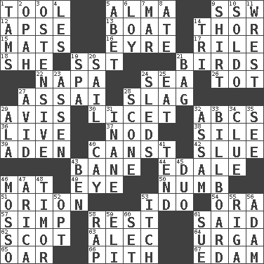 ACROSS 1. Implement 5. _ mater 9. Compass dir. 12. Domed church section 13. Water vessel 14. Son of Odin 15. Floor coverings 16. Jane of fiction 17. Cause heat under the collar 18. A female animal or person 19. Fast jet (abbr.) 21. Avian creatures 22. California wine valley 24. Ocean 26. Small child 27. Slender Brazilian palm 28. Volcanic refuse 29. Opinion 30. It is permitted: Lat. 32. Lettered men learn these first 36. Moving, as bait 37. Allow head to fall sleepily 38. Drop; flow; fall 39. Arabian gulf 40. 2nd pers. sing. pres. of can (arch.) 42. Change direction abruptly 43. Object of repulsion 44. Peak District village in England 46. Floor protector 49. Sight organ 50. Unfeeling 51. Constellation of myth 53. Wedding promise 54. Mouth or opening 57. Simple or foolish person 58. Remainder 61. Stated 62. Native of Scotland 63. Actor Baldwin 64. Capital and largest city of Mongolia 65. Boat paddle 66. Heart or essence 67. Dutch treat DOWN 1. Scottish caps 2. Brightly colored fish 3. Clearly or manifestly demonstrative 4. French article 5. Collude with 6. Myrna of the movies 7. Third mo. 8. Had dinner 9. Upper-body garment 10. Twentieth part of a lira 11. Take or capture by force 14. Three (prefix) 19. Health resort 20. Travel by water 21. Paper or plastic container 23. NE Netherlands city 24. Bobsleighs 25. Consume 27. Enthusiastic 28. Biscuitlike quick bread 29. Wing 31. Silly 32. Indian state 33. Big road sign 34. A slight indication 35. Perceive with the eye 40. Island 41. Be inclined (to) 43. Benjamin's nick name 45. Superhero pair 46. With motion or animation 47. N. Chile seaport 48. The easternmost of the Lesser Sundas 52. Elect 53. Hankering 55. Port city in Latvia 56. First of billions? 58. Strike 59. Biblical high priest 60. Arrange properly for use 61. Institute legal proceedings