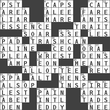 ACROSS 1. Pacific Standard Time (abbr.) 4. Balmoral and tarboosh 8. Feline 11. Type of rug 13. Toward shelter 14. Conductor's collection 15. One who doesn't tell the truth 16. Female horse 17. Pismires 18. Gist 21. Distinguishing feature 22. Fly high 23. Compass dir. 25. French article 26. Groovy apt. 29. File 13 32. Place in a line 34. Corporate head (abbr.) 35. Mouth or opening 38. Entreaty 39. Take or capture by force 41. Lairs 43. Electrical Unit 44. Period of immesurable duration 45. Intended 46. One to whom something is allotted 50. Marina Del _, California 51. Health resort 54. Keyboard modifier key 55. Coop moms 57. Columnist Joseph or Stewart 59. Heighten or intensify 63. For fear that 64. Ache 67. Operatic vocal solo 68. Collude with 69. International (abbr.) 70. Bits 71. Lair 72. Whirlpool 73. Born DOWN 1. Diluted with white 2. Indian titles of respect 3. Beverages made from leaves 4. Device for capturing images 5. Chicken ___ king 6. For each 7. Perceive with the eye 8. Lessep's creation 9. Nick name for Arthur 10. Trials 12. Ancient Greek god of war 14. At a great distance 19. Make mention of 20. 4-wheeled motor vehicle 21. Afternoon social gathering 23. "______ My Girl" (Turtles hit) 24. Native of Scotland 26. Infant food 27. Silent film actress Nazimova 28. South Vietnam president (1954) 30. Aroma 31. Thickened enlargement 33. California wine valley 36. Bring up, as a child 37. Queen of England 1702-14 39. Not ill 40. Carrot, for example 42. Filthy place 45. Not women's 47. Infant locale 48. Without thickness 49. Car or cant ending 51. First course 52. Cadet 53. NE Netherlands city 56. Petty quarrel 58. Baseball player Mel 60. SW Asia republic 61. Travel on an animal 62. Relaxation 64. Sliced dessert 65. Plus 66. It would