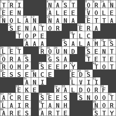 ACROSS 1. Three (prefix) 4. Political cartoonist Thomas 8. NW Algerian seaport 12. Car or cant ending 13. Toward shelter 14. Grand slam 15. Pitcher Ryan 18. Grandmother 19. Singer James 20. Legislator 22. Epoch 23. Drink excessively 24. Affectionate concern, for short 25. American Automobile Association (abbr.) 26. Deli grouping 30. Allow 33. Unit of ammunition 36. Transmitted 37. Mouths or openings 39. Girls' org. (abbr.) 40. False hair 41. Play 42. Oozy 44. Small child 45. Center 47. Begley and Asner 50. Black tropical American cuckoo 51. 57 in ancient Rome 53. Make supply last 54. Apple salad 57. Measure of real estate 59. Perceives with the eye 61. Snob 63. Den 64. Hyperbolic tangent 65. Not either 66. Ancient Greek god of war 67. Johnson of "Laugh-In" 68. Filthy place DOWN 1. "___ Little Indians" 2. Vintage cars 3. An arm off of a larger body of water 4. Billionth: prefix 5. Having or resembling wings 6. Elected rep. 7. Afternoon social gathering 8. Cloudy 9. Roll call or roster of names 10. The first octave above the treble staff 11. Teachers' org. 16. Small Philippine buffalo 17. California wine valley 21. Separate forcefully 22. Pipe bend 24. Small boy 26. Fastener 27. Confront 28. To the inside or interior of 29. Proofreading order 30. Old wives' tales, e.g. 31. Greek god of love 32. Scottish caps 34. Double curve, resembling the letter S 35. Purpose 38. Orators 42. _-fi 43. Shout 46. Compass dir. 48. Movie discs 49. The Jewish people; Israel 52. Metal shackles 53. 4th largest of the Great Lakes 54. Left 55. American tennis player Robert 56. One third of a yard 57. In the manner of 58. Auto 59. R.R. building 60. Hearing organ 62. Attempt