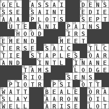 ACROSS 1. Set 4. Slender Brazilian palm 9. Hiding places for outlaws 13. Compass dir. 14. Inhabitant of Heaven 15. Singer Brickell 16. Auto club (abbr.) 17. Secret plans 18. Back-to-school mo. 19. Shoshoni 21. Black tropical American cuckoo 22. Aches 24. Parka part 26. Big collection agency 27. Make improvements or corrections to 29. Rendezvous 30. Laconic 31. Ketch in the Levant 33. Affectionate concern, for short 36. Make a knot 37. Paper fasteners 40. Rowing implement 41. Added to 42. International (abbr.) 43. Silly 45. Scottish caps 47. Cabin 48. _ de Janeiro 49. Elected reps. 50. Peter (Polish) 52. 23rd letter of the Greek alphabet 54. Baseball player Mel 56. Electrical Unit 57. Memphis, Tenn. Street 59. Mouth or opening 61. Kill 62. Composer Copland 63. Lubricate 64. Water source 65. Get up 66. Car dealer's back yard DOWN 1. Girls' org. (abbr.) 2. Son of Isaac 3. Resembling or made to resemble leather 4. Cleo's killer 5. First course 6. The Jewish people; Israel 7. Against 8. ___ a Wonderful Life 9. Stop 10. Genesis locale 11. Cuts off 12. Put into a specified state 20. Immeasurably long periods of time 22. Component 23. "We ___ not amused" (Victoria) 25. Lyric poems 27. Singer James 28. Count _ (2 wds.) 29. Place where flour is made 31. Without 32. Fitting 33. Inedible or poisonous agaric 34. Austrian-born American filmmaker Fritz 35. Algonquian 38. The easternmost of the Lesser Sundas 39. Filth; sediment 44. Words to Nanette 45. Trinitrotoluene 46. Small island 49. Grain storage towers 50. Light colored 51. Slanted text style (abbr.) 52. Lightbulb-shaped fruit 53. Indian skirt 55. Musical group of three 56. Compass dir. 57. Sound made by sheep 58. Compass dir. 60. The first octave above the treble staff